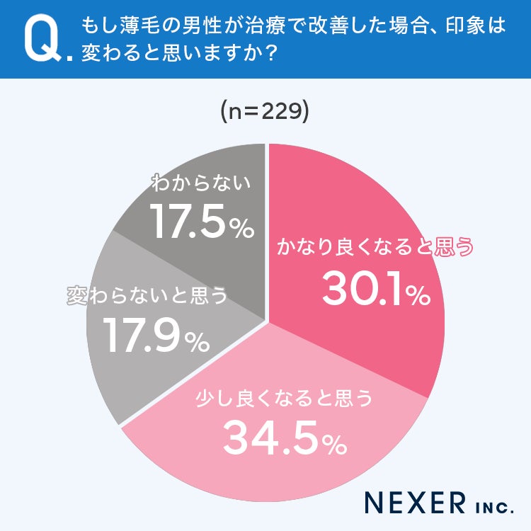 また、薄毛の男性が治療で改善した場合、印象が良くなると回答した方は合計64.6%でした。