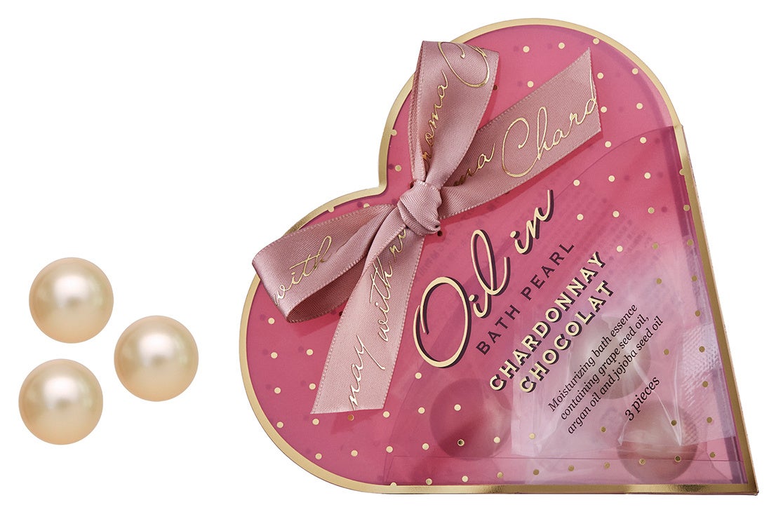 今シーズンは、きらめく大粒パールのような入浴料「オイルインバスパール」がちょっとしたお礼やお返しにもぴったりなハート型パッケージに入って新登場。11月12日より新発売します。幸福感あふれるシャルドネショコラの香りで至福のひとときを。