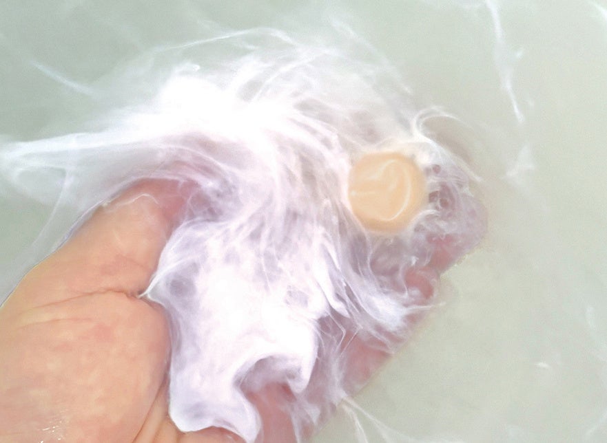 湯船に入れると心地よい香りとうるおいケア成分が溶け出し、まろやかな湯ざわりに。湯色:乳白