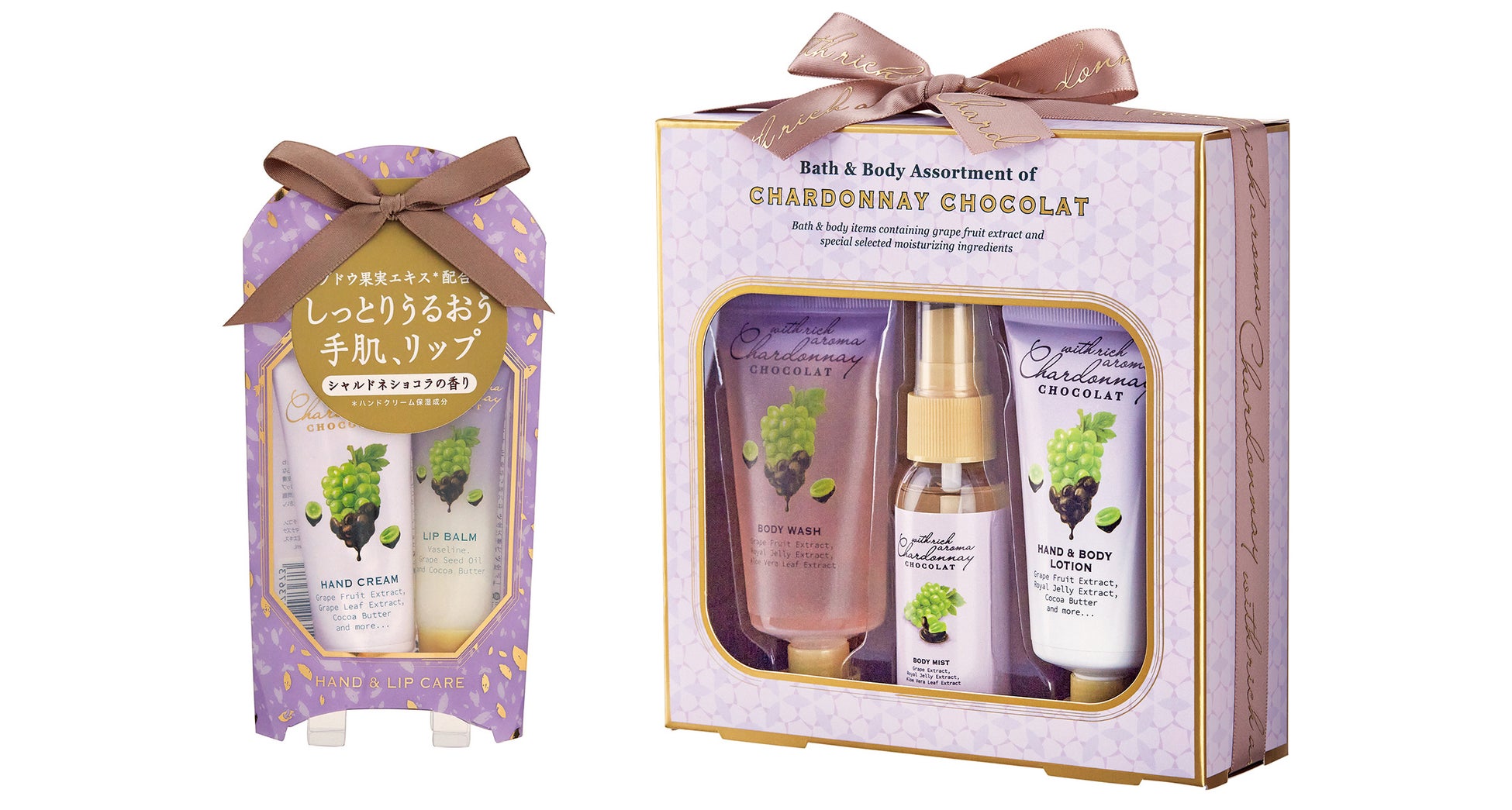 シャルドネショコラのアロマをたっぷり楽しめるバス&ボディー3点セット。華やかなパッケージでギフトにもおすすめです。
