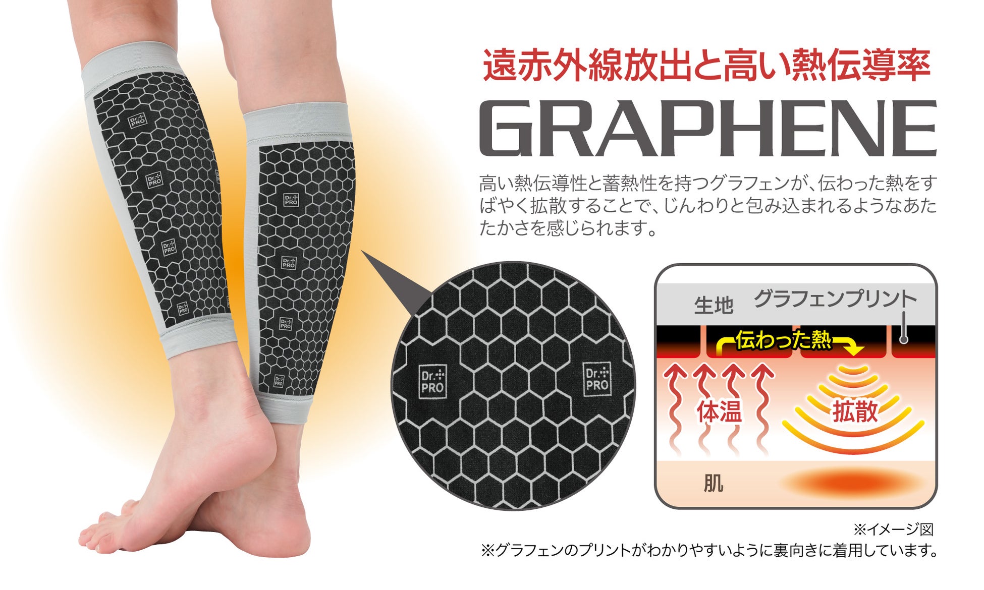 内側は特殊素材『GRAPHENE』をプリント!高い熱伝導率と蓄熱性により、ふくらはぎをじんわり温めます。