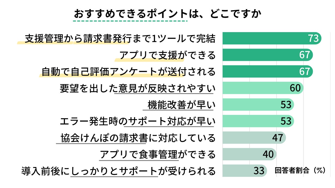 特に「支援管理から請求まで1つのツールで完結できる」「自己評価アンケートの自動送付」「アプリで支援できる」といった点が高く評価されました。
