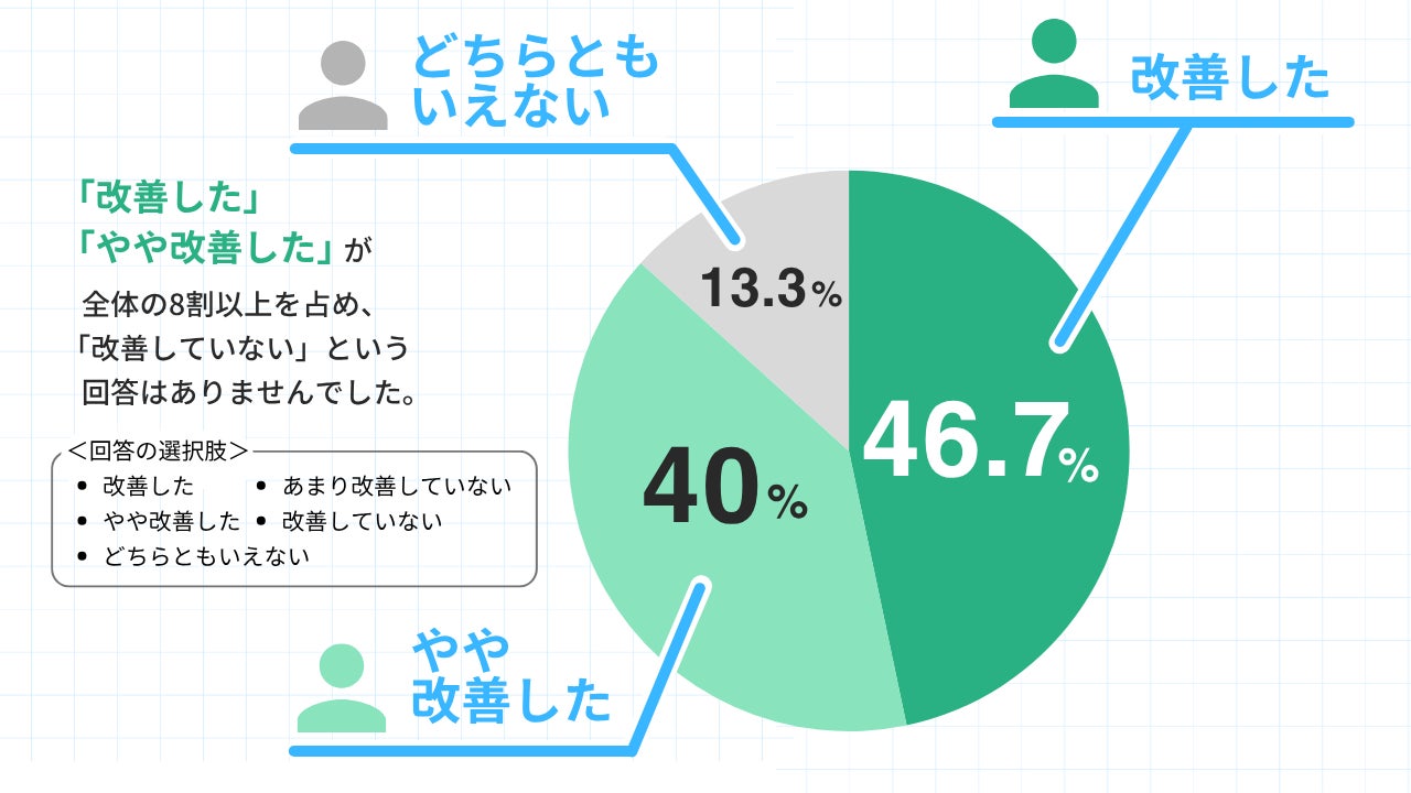 当社が2025年8月に実施したアンケートでは、アンケートに回答してくださった「カロミル保健指導」を利用する指導機関の86.7%が「業務効率が改善した」と回答しました。