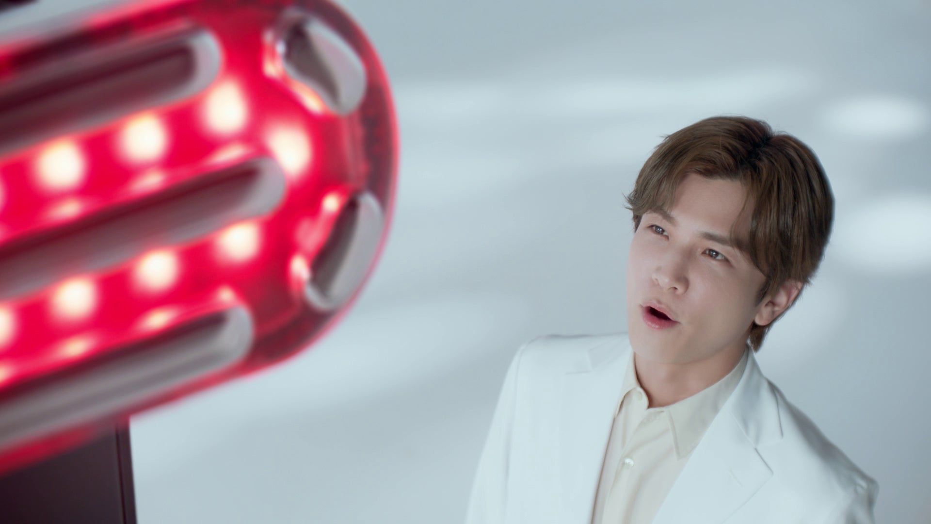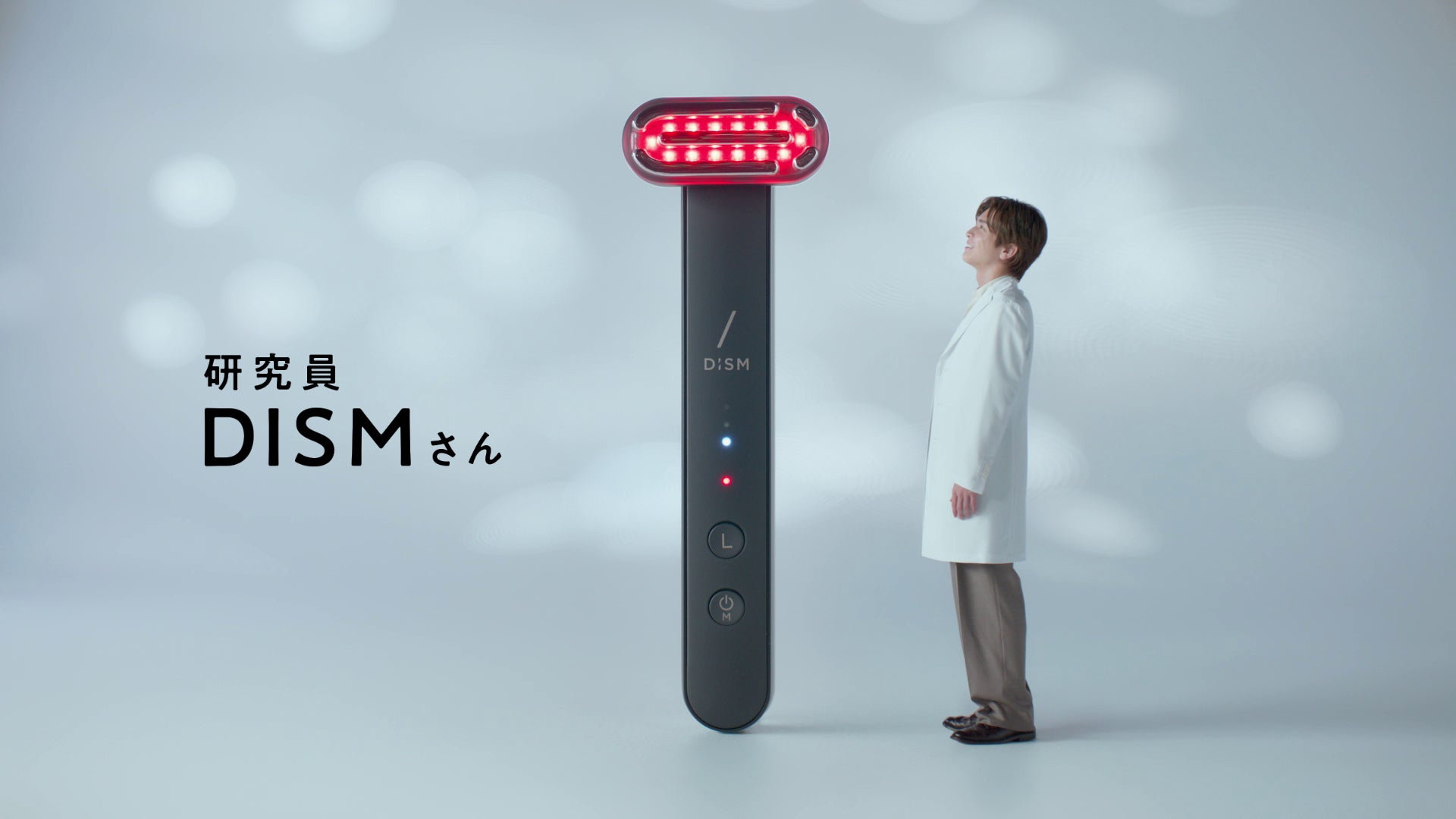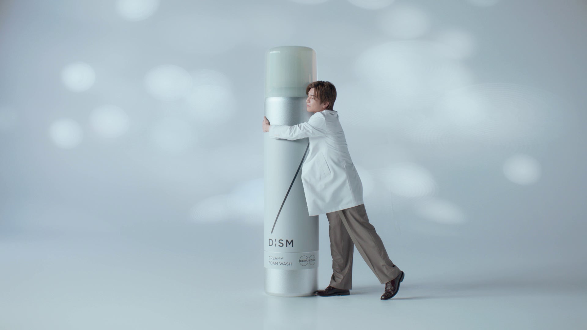 「ディズム 美顔器 研究篇」 では、巨大な美顔器を惚れ惚れと見上げながら「ワオ」とつぶやき、「お~、コンパクト…なのにパワフル!?」と、自分のアイデアに改めて驚いた様子。大きく手を振りながら嬉しそうに美顔器のまわりで一生懸命にアピールする姿から、美顔器の出来栄えに対する興奮も伝わります。「ディズム 白泡洗顔 飛び出る篇」 では、洗顔ボトルからひょっこり顔を出したDISMさんが「成功しちゃった」とお茶目に小声で一言。たっぷりな泡で満足げに洗顔したり、抱き着いたりと、可愛らしい様子が描かれます。