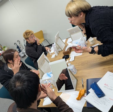 ベースメイクのセッションでは、モデルへのデモンストレーションを通じて、メイクバレすることなく肌を綺麗に見せるメイク方法を伝授。参加者一人ひとりを丁寧にサポートしつつも、基本的には参加者自らが仕上げる形式で行い、翌日から自分ひとりでも再現できる実践的なスキルを身につけました。参加者は自身の肌の見た目が変わっていくことを楽しみながら、美容のスキルを習得していました。