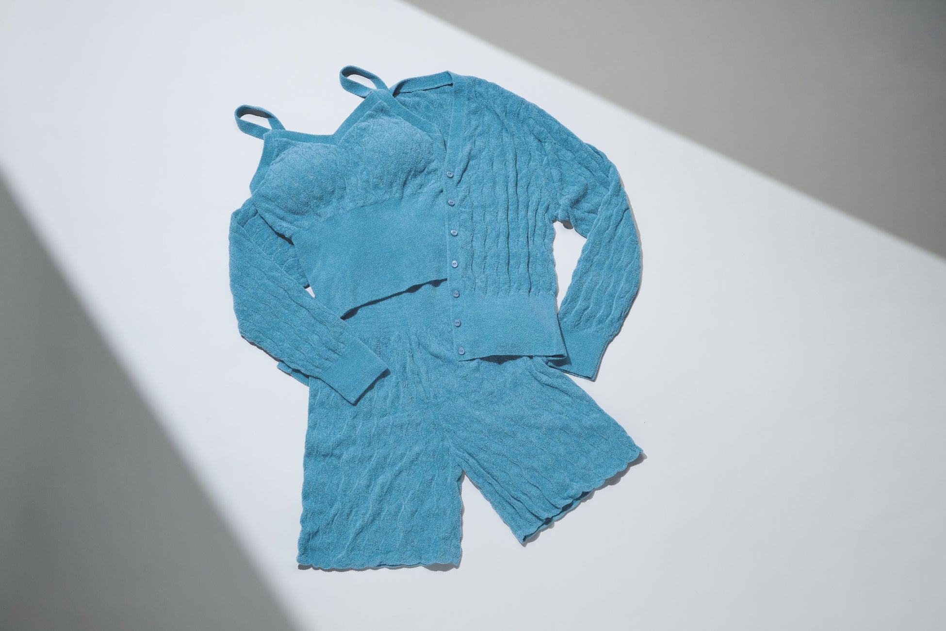 唯一無二の“透かし編み”をデザインに取り入れたニットランジェリーは、肌にやさしくフィットしながら、着るだけで気持ちよく自然と体を温める。糸を使い切るミニマルでサステナブルな温活ライフを、あなたへ。