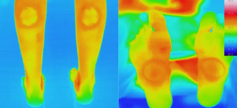 ・サーモグラフィー解析によると、温活玉を装着したところが赤くなり、体温が高くなっていることが分かります。