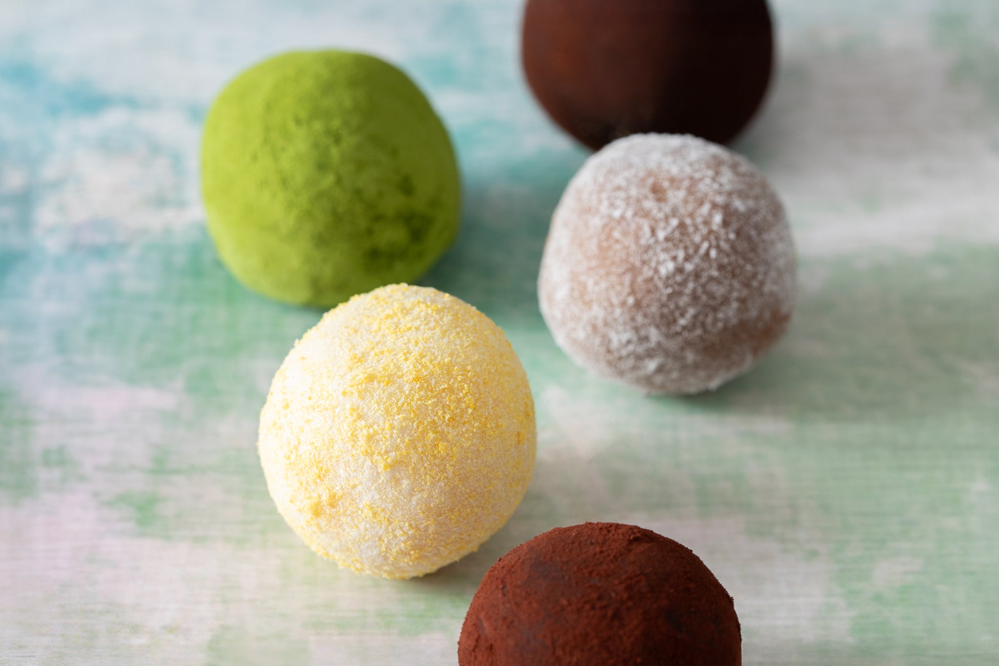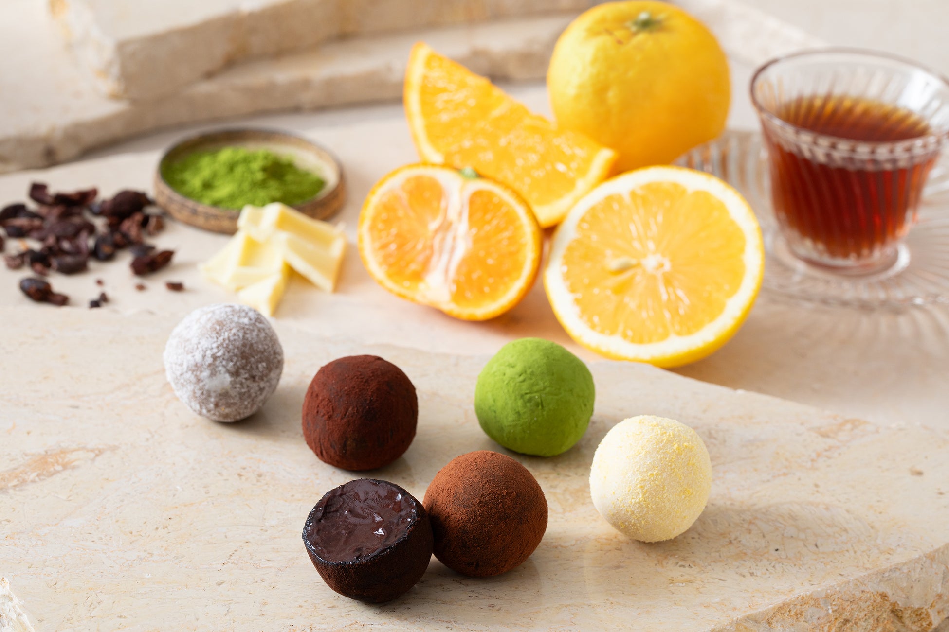 「クラシック」「ライム発酵」「みかん発酵」の3つのフレーバーは、同一の配合に揃えることで、発酵によるカカオの風味の違いを明確に感じていただける構成に仕上げました。また、抹茶や紅茶を合わせたトリュフは、なめらかな口どけとともにお茶の深みと柑橘香りが重なり合うフレーバー。カカオが持つ多彩な表情を、ぜひこのトリュフでご堪能ください。
