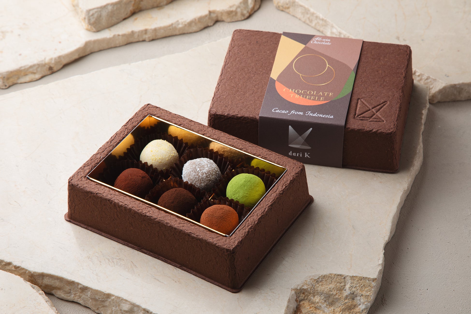 「dari K」のチョコレートは、インドネシア・スラウェシ島の農家と大切に育てたカカオから作られています。厳選した素材とシンプルなレシピで、フルーティーなカカオ本来の味わいを実現しました。「つくる人、たべる人、くらしと自然。みんなが笑顔になれるAll-win Chocolate」をコンセプトに、農家とともに品質を高めたカカオを適正価格で取引することで、持続的な取り組みを目指しています。