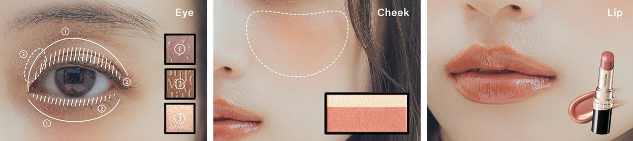 目もとに抜け感のあるウォームピンクをベースにしながら、目のキワに秋冬らしいブリックブラウンを細く重ねて立体感を。まぶた全体がふんわり血色づきながら、引き締まった印象に仕上がります。