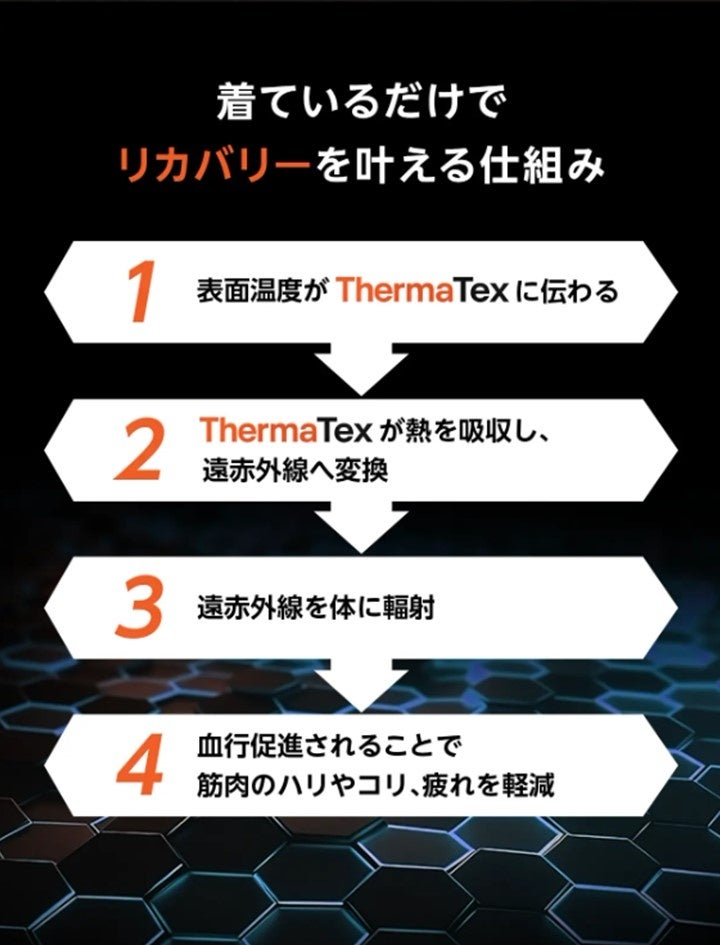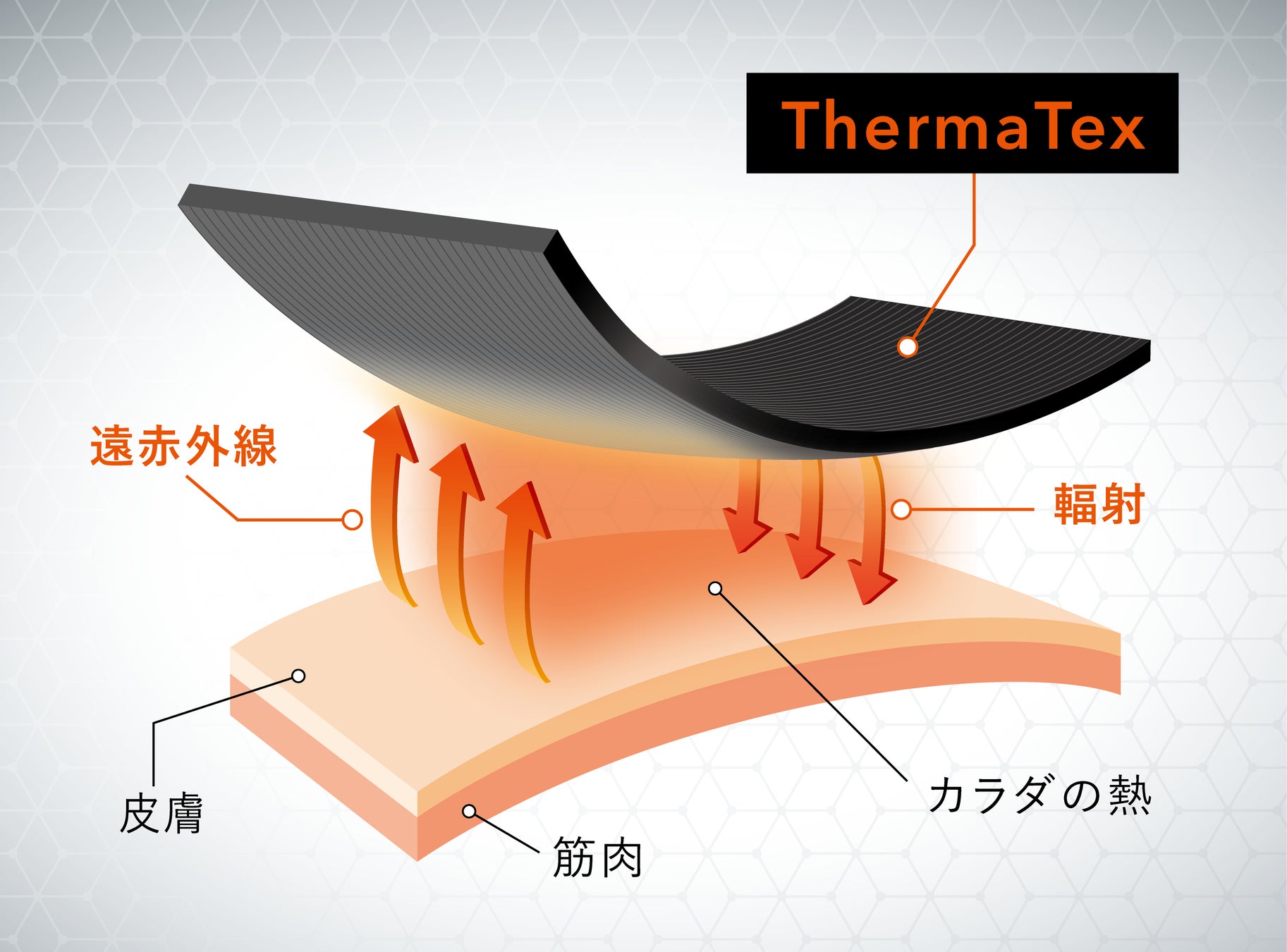 このThermaTexが、人間から放出される熱を遠赤外線へ変換して輻射してくれる機能を有し、「血行促進」や「疲労回復」といった、嬉しい効果を生み出します。