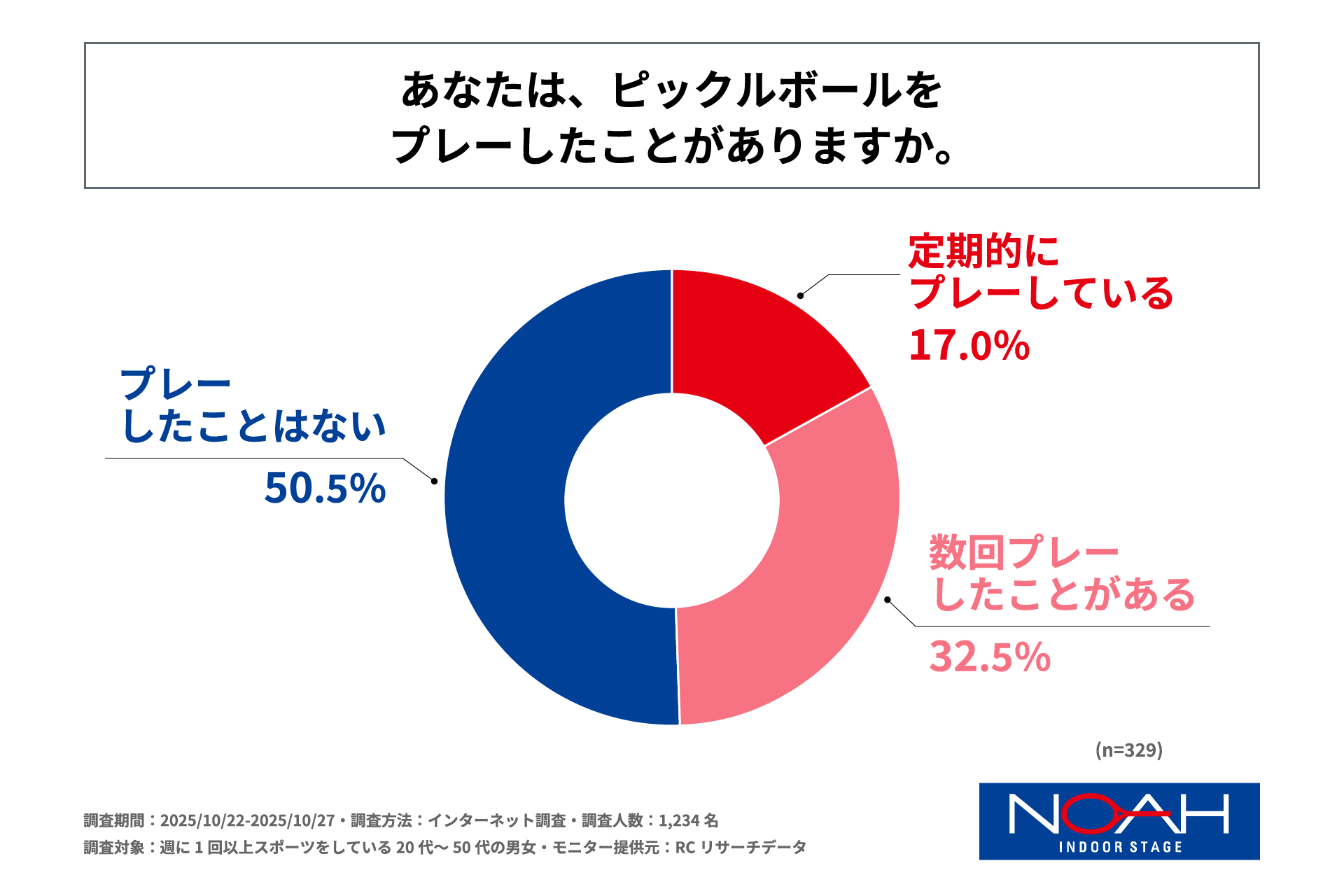 アメリカ発祥の新しいスポーツ「ピックルボール」は、近年、世界的に急成長を遂げており、オリンピック競技化への期待も高まっています。日本国内でも注目を集める一方、この急成長中のスポーツが、スポーツに関心のある層にどの程度浸透しているのか、その実態はまだ明らかではありません。そこで、「テニススクール・ノア」は、週に1回以上スポーツをしている20代~50代の男女を対象に、ピックルボールの経験者の割合や認知度に関する実態調査を実施しました。