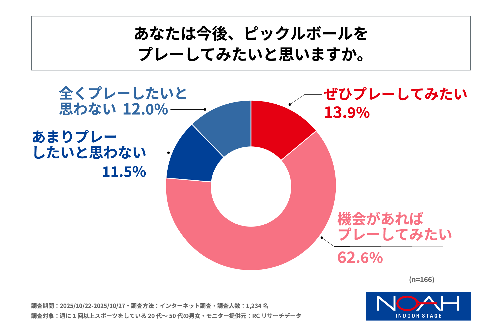 次に、ピックルボールのプレー経験がないと回答した人を対象に「今後、ピックルボールをプレーしてみたいと思うか」を尋ねる設問への回答では、1位が「機会があればプレーしてみたい」で62.6%、2位が「ぜひプレーしてみたい」で13.9%、3位が「全くプレーしたいと思わない」で12.0%という結果になりました。1位と2位の回答を合計すると回答率76.5%となり、この結果から、週に1回以上スポーツをしており、ピックルボールのプレー経験がない20代~50代の男女の75%以上が、今後ピックルボールをプレーしてみたいと考えていることがわかりました。