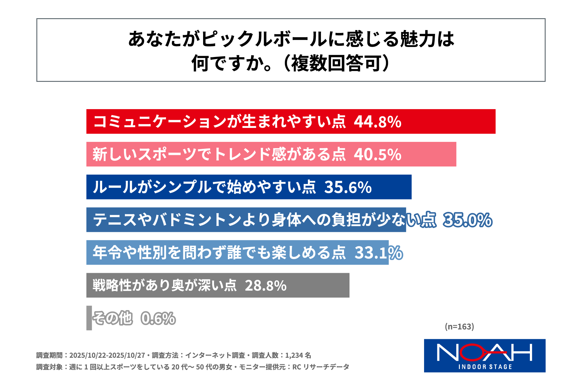 また、ピックルボールのプレー経験がある(数回プレーしたことがある、定期的にプレーしている)と回答した人を対象に「ピックルボールに感じる魅力」を尋ねる設問への回答では、1位が「コミュニケーションが生まれやすい点」で44.8%、2位が「新しいスポーツでトレンド感がある点」で40.5%、3位が「ルールがシンプルで始めやすい点」で35.6%という結果になりました。この結果から、週に1回以上スポーツをしており、ピックルボールのプレー経験がある20代~50代の男女が、ピックルボールに感じる主な魅力は「コミュニケーションが生まれやすい点」や「新しいスポーツでトレンド感がある点」であることが明らかになりました。