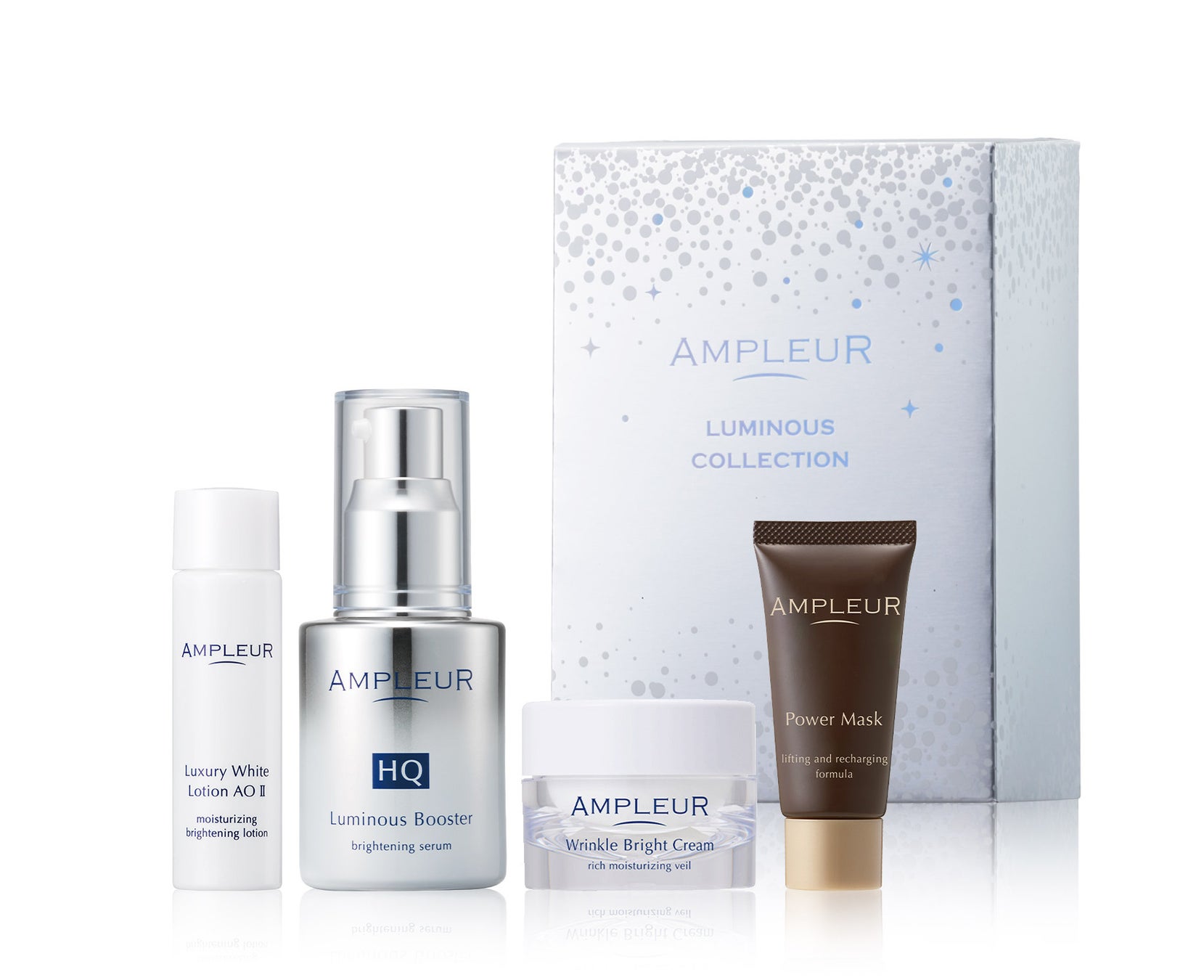 「アンプルール ルミナスコレクション」は、みずみずしい透明感と明るさを放つ肌を目指すためのブライトニング*²・コレクションです。主役の「ルミナスHQブースター」現品に、人気のローション、薬用シワ改善美白クリーム、そして2025年10月発売の新作ナイトマスクのミニサイズをセット。輝く雪の結晶の煌めきをイメージした特別なパッケージに、ブランドの自信作が凝縮されています。