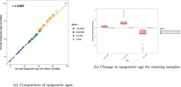 (a) 全バッチを同時にComBatで補正したデータと、iComBatで逐次補正したデータから算出したエピジェネティック年齢の散布図。非常に高い相関係数を示した。