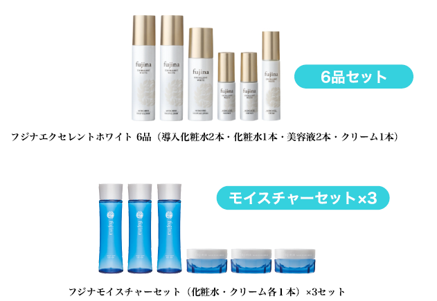 「フジナエクセレントホワイト 6品」(導入化粧水 2本・化粧水 1本・美容液 2本・クリーム 1本)または「フジナモイスチャーセット」(化粧水・クリーム 各1本)×3セットのいずれか