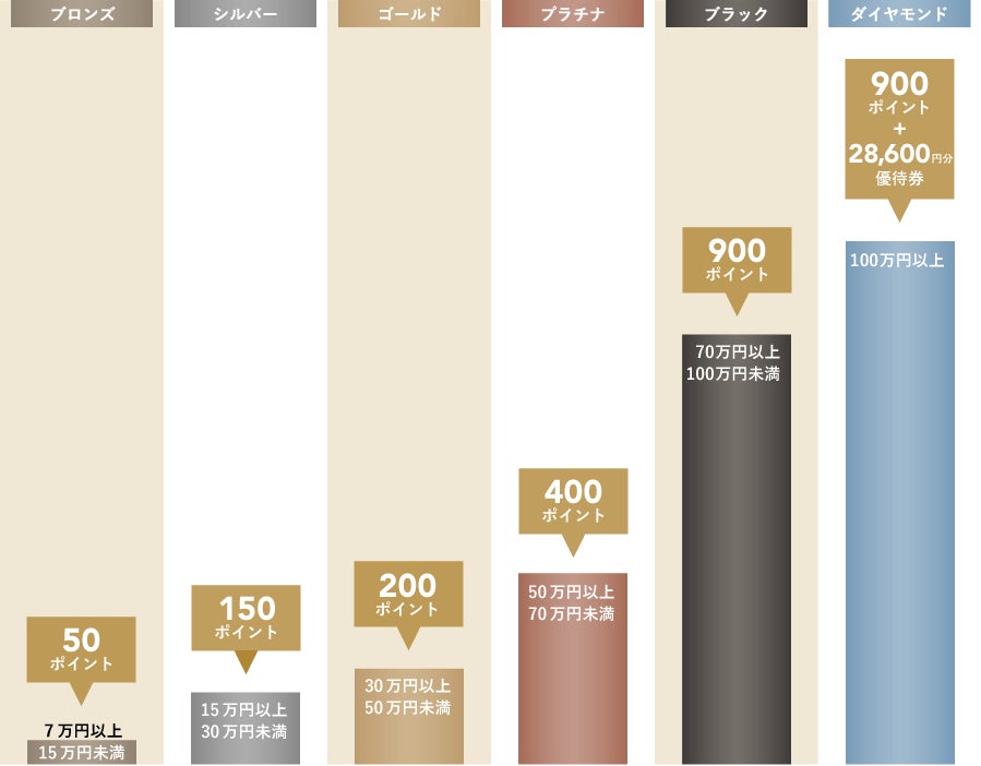※1月1日~12月31日の1年間のご利用金額に応じ「ステイタスランク」が決定し、翌年度4月1日~3月31日までの1年間それぞれのランクに応じた特典を受ける事が出来ます。