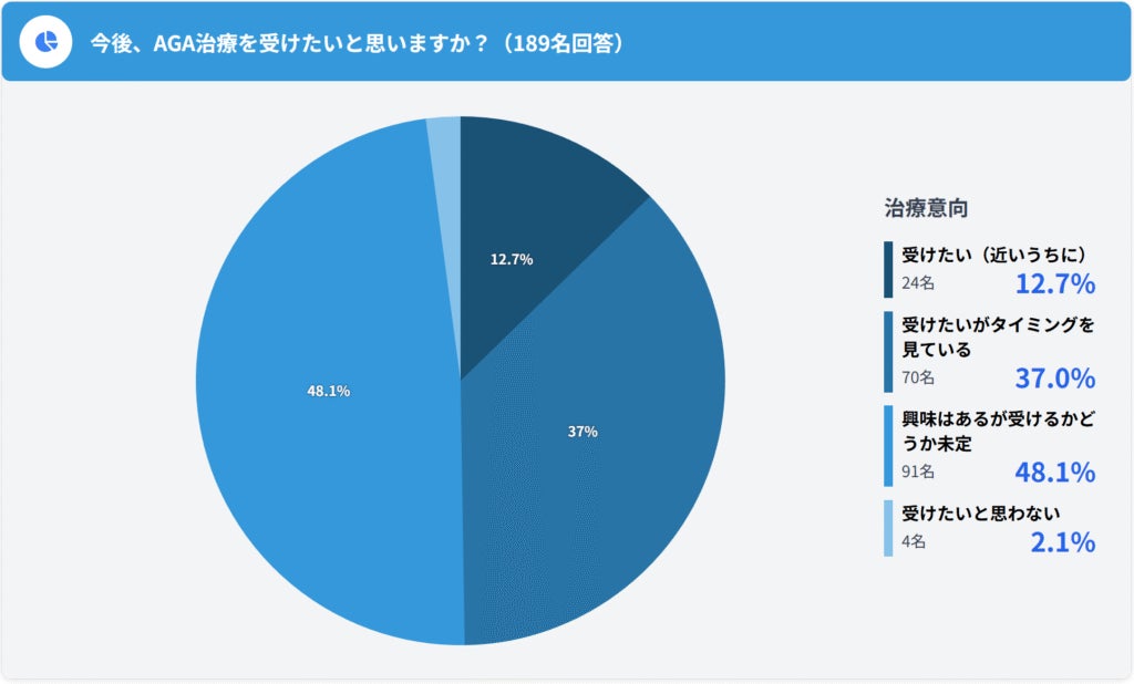 「興味はあるが具体的な行動は未定」が51.3%と半数を占めるものの、「近いうちに始めたい」(29.1%)、「すぐにでも始めたい」(15.3%)を合わせると44.4%にのぼります。これは、AGA治療が身近な選択肢として広く認知され、行動に移す一歩手前の潜在顧客が非常に多いことを示しています。