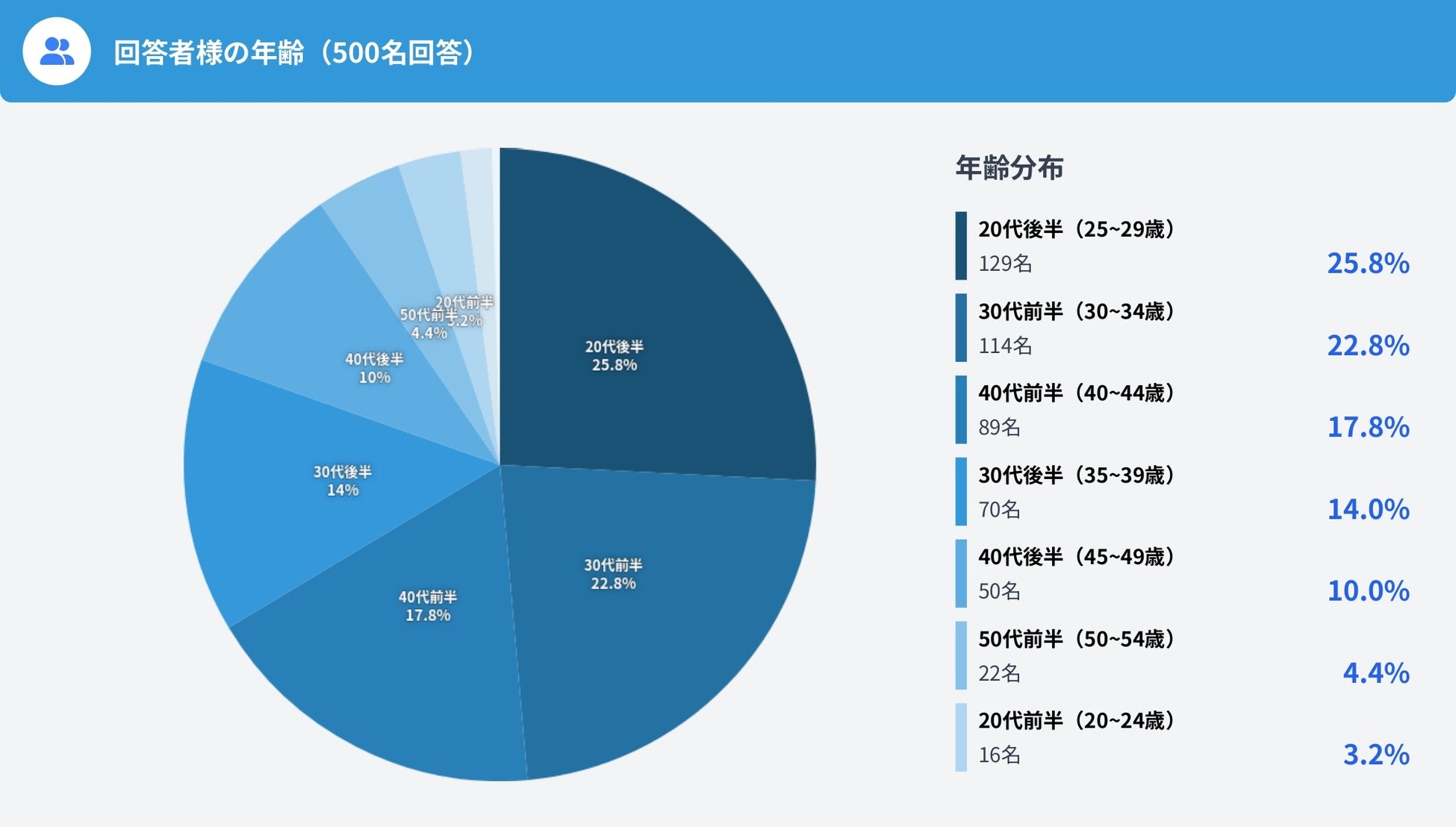 回答者は20代後半から40代までが約7割を占め、薄毛を意識し始める主要な層の意見が反映されています。また、性別は男性が51.3%、女性が46.6%とほぼ半々であり、薄毛の悩みが性別を問わず広がっている現代の状況を明確に示しています。特に女性の回答比率の高さは、女性向け薄毛治療市場の大きなポテンシャルを示唆しています。