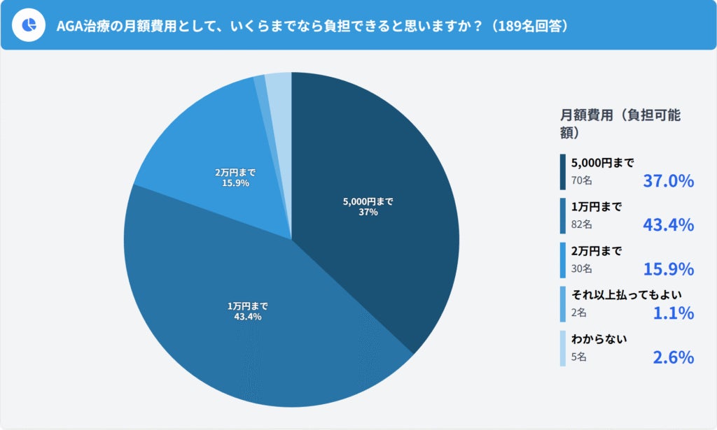 「1万円まで」(43.4%)と「5,000円まで」(37.0%)を合わせると80.4%に達しました。多くの人が無理なく継続できる低価格での治療を望んでいることが明確です。現在のAGA治療の平均的な価格帯と消費者の希望額には乖離があり、このギャップを埋めるサービスが市場の大多数を惹きつける鍵となります。