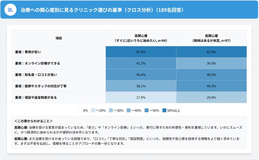 高関心層(すぐにでも/近いうちに始めたい): 「費用が安い」(68%)、「オンライン診療」(41%)、「通いやすい立地」(40%)など、治療開始のハードルを下げる実利的な項目を重視する傾向が強いです。低関心層(興味はあるが未定): 「知名度・口コミが良い」(51%)、「医師やスタッフの対応が丁寧」(45%)、「保証制度」(27%)など、信頼性や安心感を担保する情報をより重視しています。