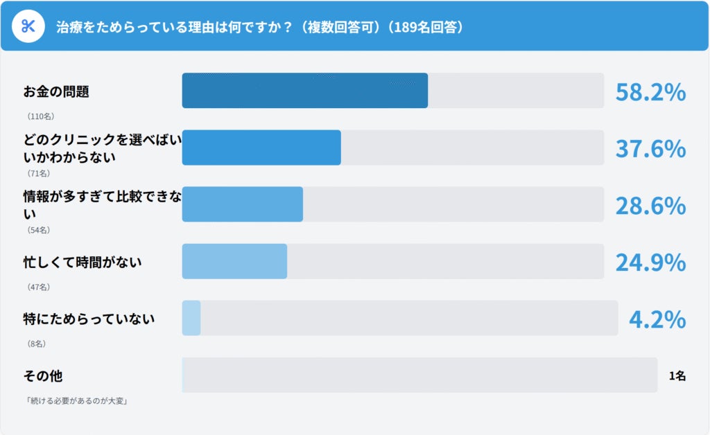 • 最大の障壁: 治療を検討する上での不安は「費用が高そう」(66.1%)、ためらう理由は「お金の問題」(58.2%)が最多。