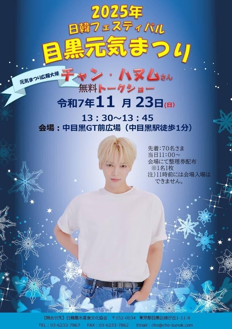 2023年に「初恋」でソロ歌手デビュー、Mnet「BOYS Ⅱ PLANET」でも人気を集めた歌手チャン・ハヌムさんの無料トークショーを23日13時30分から実施します。先にインスタに応募していただいた70名限定になります。御注意ください。※チャン・ハヌムさんは今回の目黒元気まつりの広報大使として任命されています。