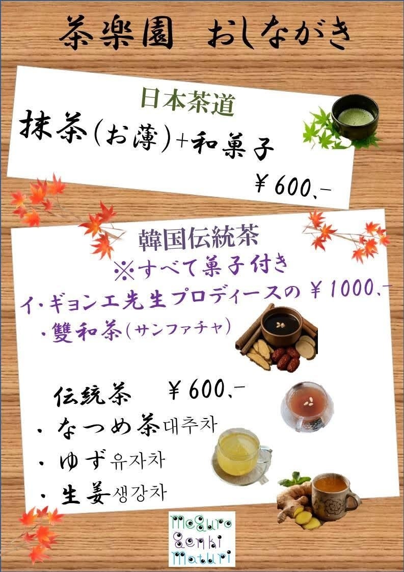 お茶カフェ「茶楽園」では、日本の茶道と韓国の伝統茶をお楽しみいただけます。日本の茶道としては抹茶+和菓子のセット、韓国伝統茶としてイ・ギョンエ先生プロデュースの雙和(サンファ)茶のほか、ゆず茶、ナツメ茶、生姜茶、すべてお菓子付きで販売いたします(税込各600円)。