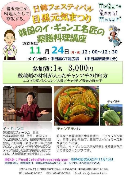 一般社団法人 日韓農水産食文化協会(会長:八木裕子)は、大韓民国韓食フォーラム京畿連合会、同日本支会との共催により、2025年11月23、24日に、中目黒駅徒歩1分の中目黒GT前広場(目黒区上目黒2-1-1)にて、目黒区ほかの後援で開催します。