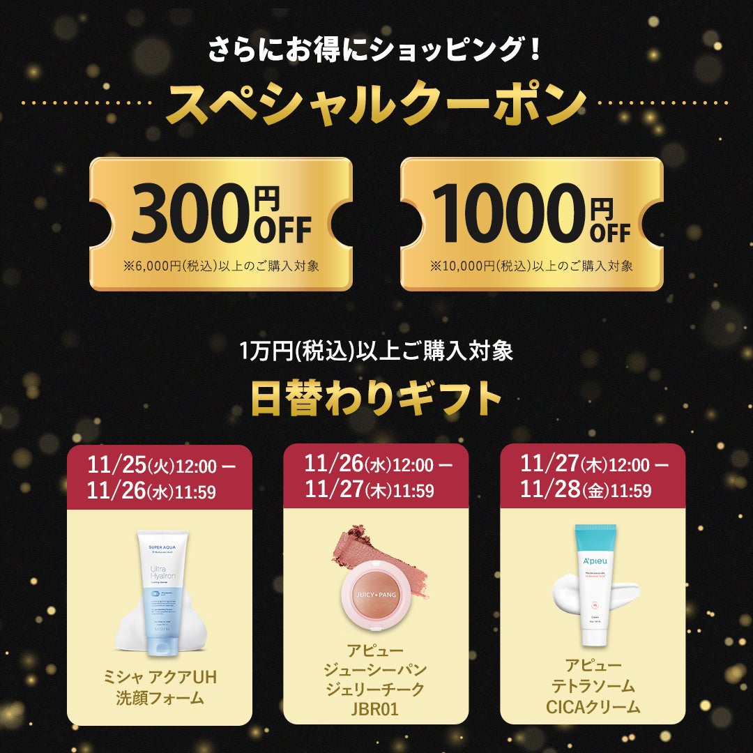 10,000円以上「ブラックフライデーセール」期間中にお買い上げいただくと、日替わりで商品現品もプレゼント!