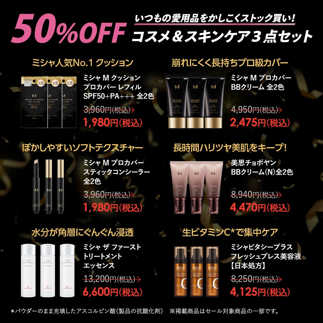 ミシャジャパン公式オンラインショップで人気のアイテムを3点セット50%OFFで販売。