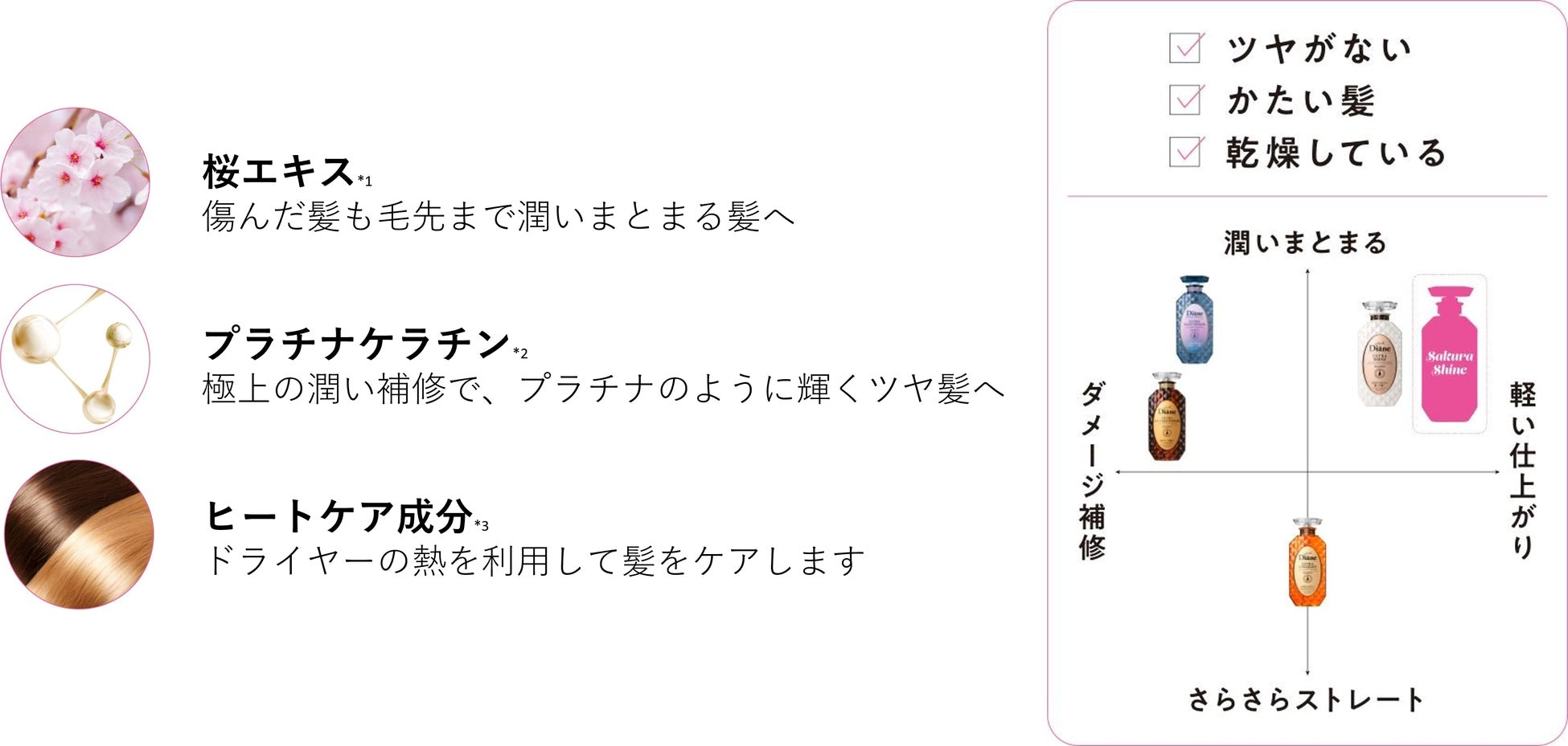 桜エキス*1、オーガニックアルガンオイル*2、そして独自のプラチナケラチン*3 を配合し、髪に潤いを与えながら、まるでプラチナのように輝くツヤ髪へ導きます。