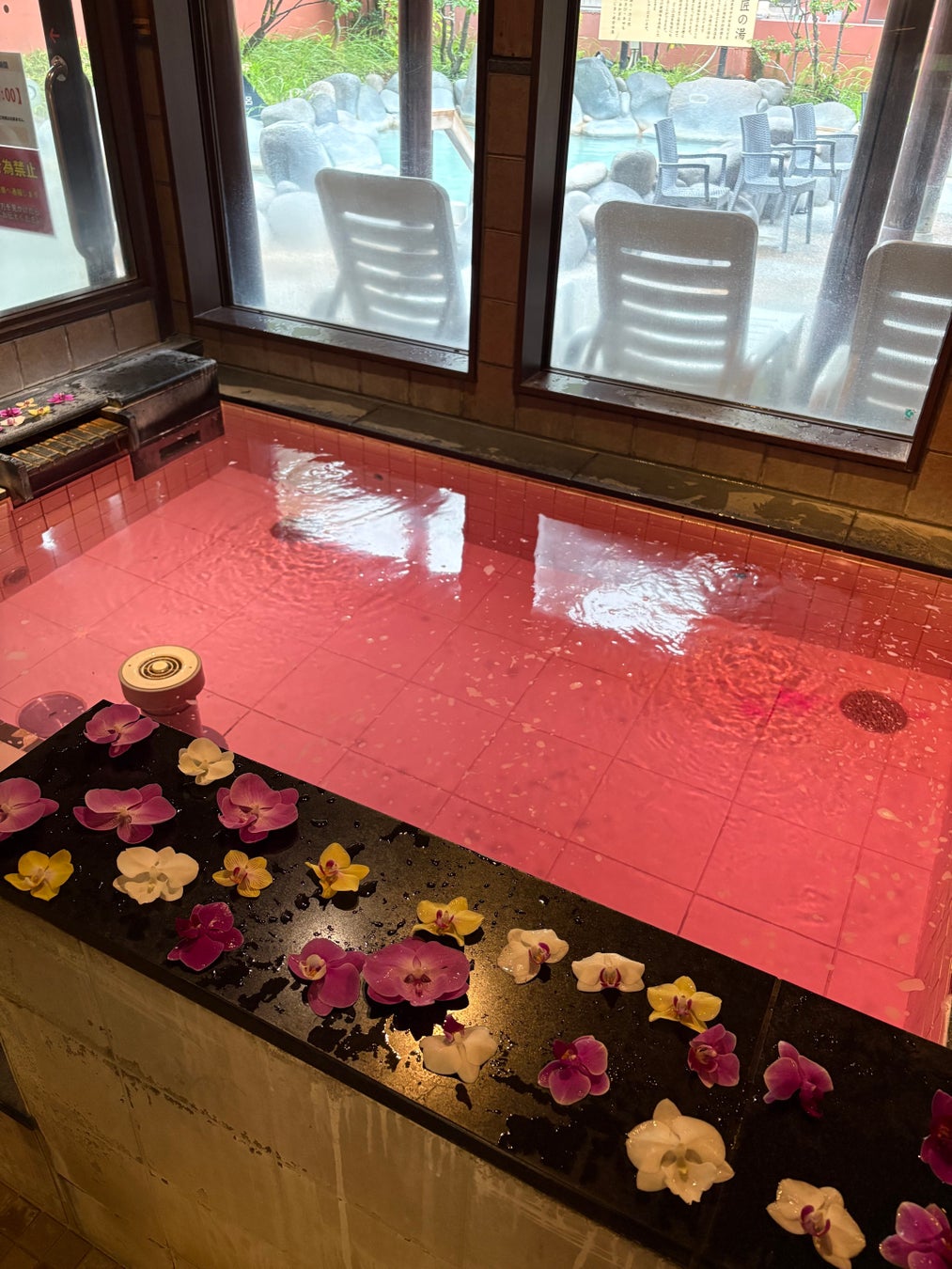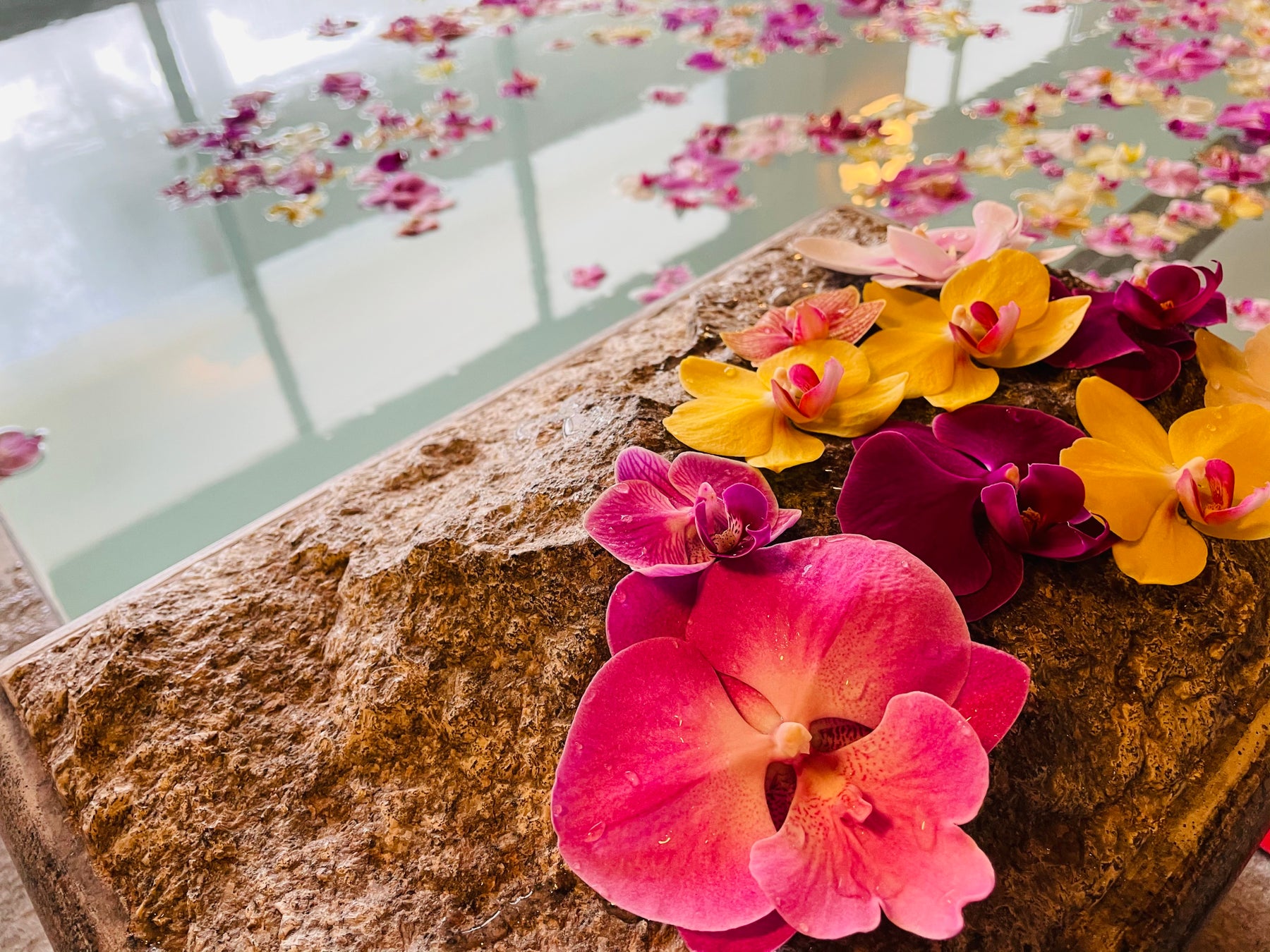 お湯は淡いピンク色に染まり、照明に反射して柔らかく輝きます。胡蝶蘭由来の香りが全身を包み込み、心まで解きほぐされるような幸福感は、まるでスパリゾートに訪れたような“自分へのご褒美時間”を演出します。また、浴槽に浮かぶカラフルな胡蝶蘭の生花は彩りのアクセントとして使用され、視覚的にも特別な光景をお楽しみいただけます。