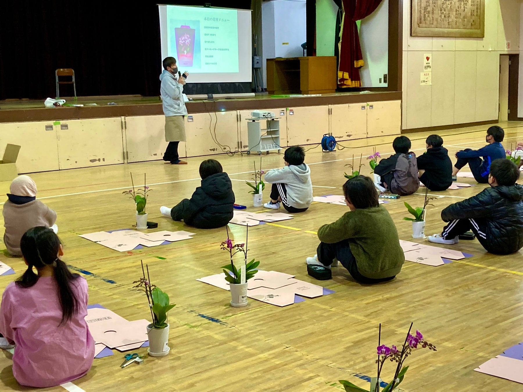 花を咲かせる喜びと心を育てる教育として、児童が自分の力で胡蝶蘭の花を咲かせ、大切な人へプレゼントする特別授業です。