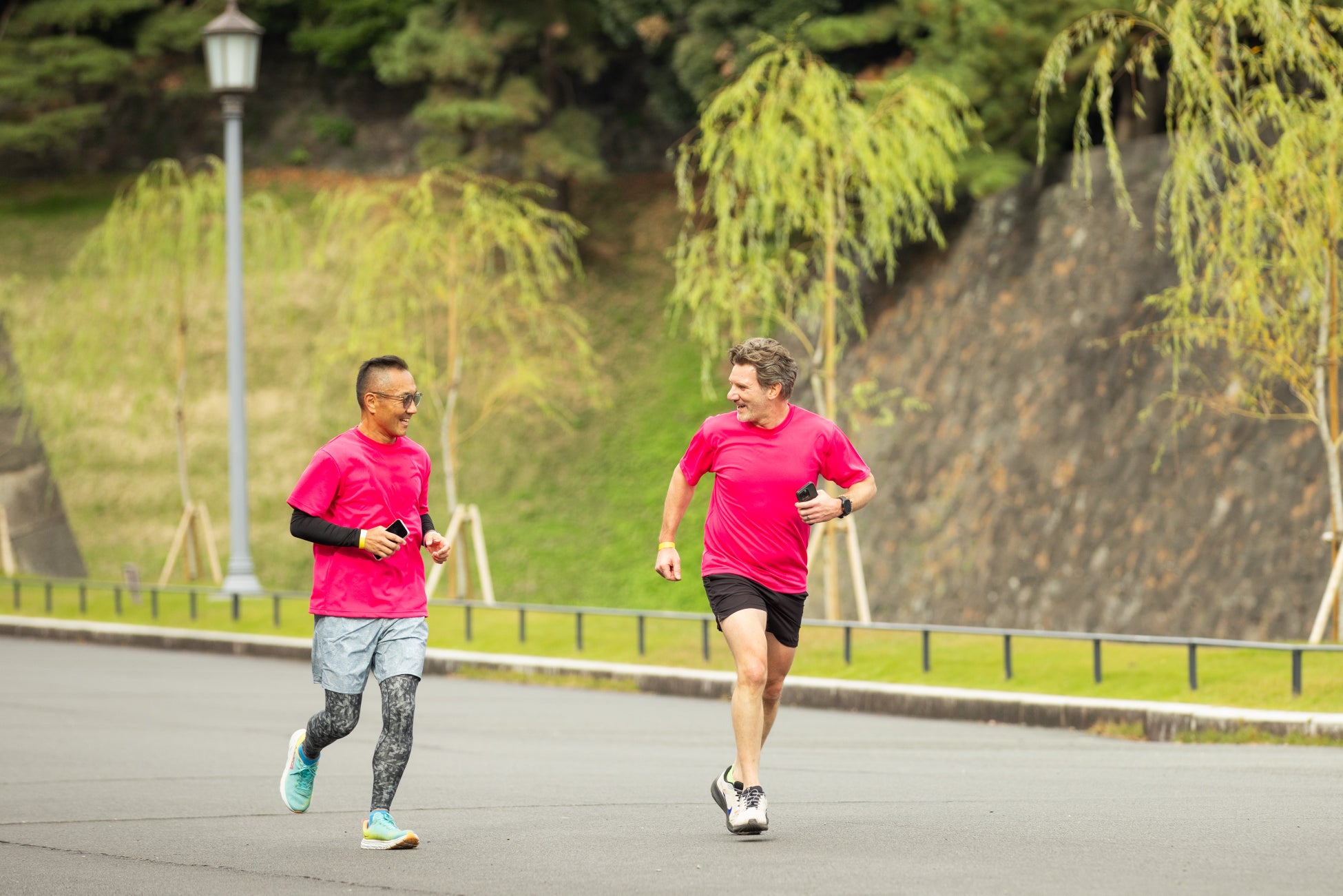 桜田門広場をスタート地点とし、二重橋前や千鳥ヶ淵など皇居外周約5kmのコースを反時計回りにRun & Walkで巡り、スタート前には、ELCジャパン 職務執行者社長のジェームズ アクィリナがあいさつを行いました。「1992年にエヴリン H. ローダーが始めた『乳がんキャンペーン』は、1996年から日本ではエスティ ローダー カンパニーズがリードしてきました。皆さんの情熱やサポートが、研究への資金調達や認知度の向上を支えています。これは企業としての取り組みであると同時に、日本というコミュニティ全体を一つにするすばらしい活動だと思います。早朝からのご参加に感謝します。皆さんが着ているピンクのTシャツは、乳がんへの認知度向上と、(乳がんを)終わらせようという願いを象徴するシンボルです。このTシャツを着て、皇居の周りを一緒に歩いたり走ったりしてくださるということで、本当にありがとうございます。皆さんがこうして同じカラーの服を着て取り組みに賛同し、今日参加してくださっていることは、本当にコミュニティとしての強さの現れだと思います。皆さんの参加は意味のあることですし、私たちの会社にとっても大きな支えになっています。ありがとうございます」と語り、会場を温かい拍手が包みました。朝の空気は冷たかったものの、参加者の表情は明るく、スタートの掛け声で笑顔とともに爽やかに走り出していきました。