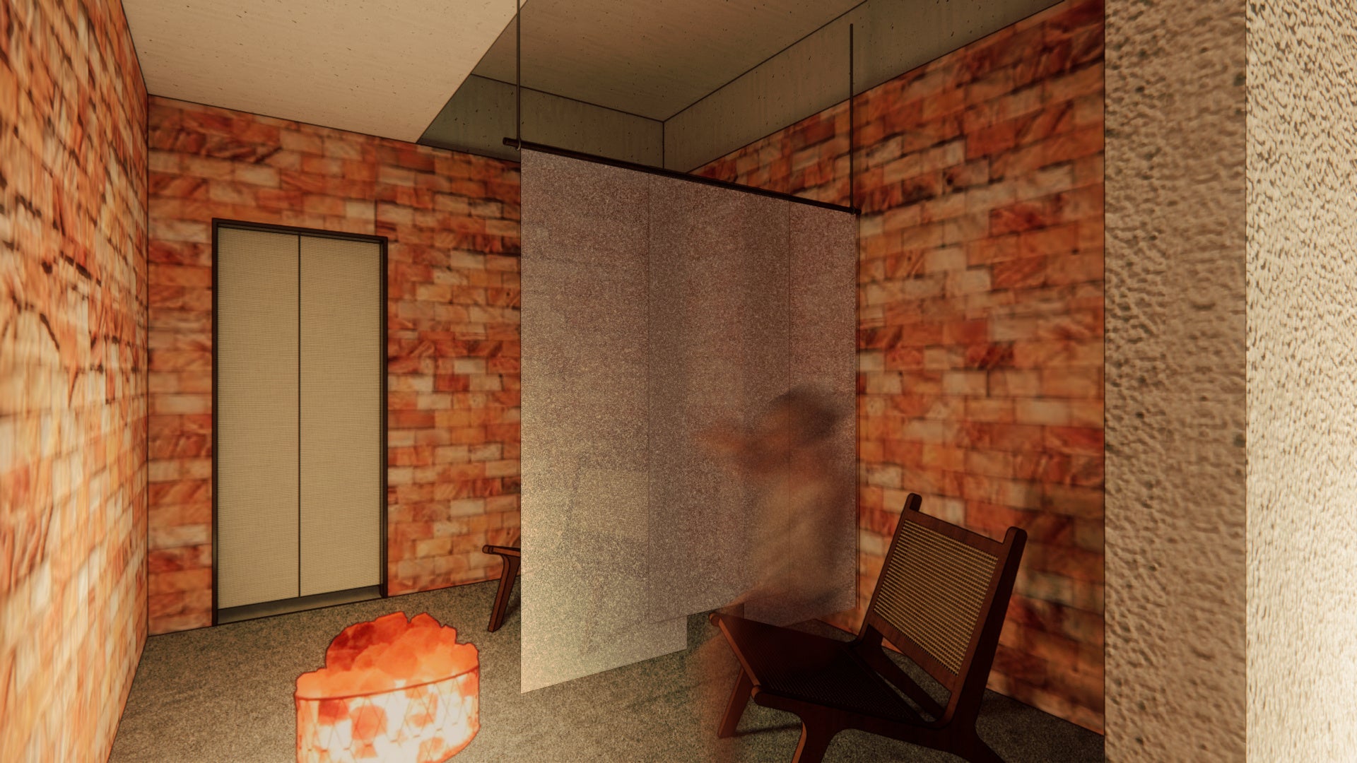『CAVE』 は、過剰な情報のノイズが静まる場所。ピンクソルトの壁、包まれるような安心感、足元にひろがる塩、抑えた灯り。思考の音量は下がり、呼吸は本来のテンポを取り戻し、感覚は澄んでいく。