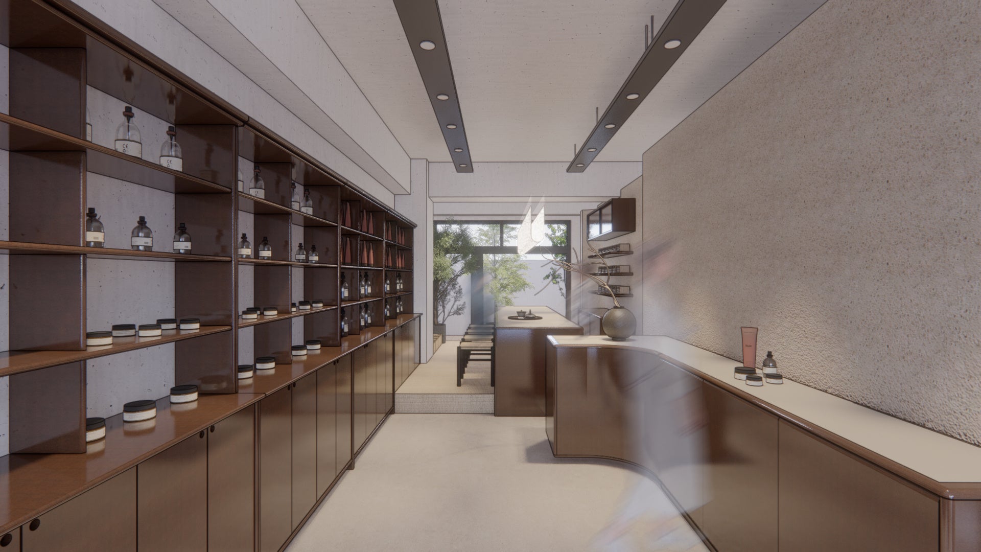ブランドが大切にしている「内側から癒す」という思想を、空間としてどう体現できるかを考えました。テーマは“洞窟”のように包み込まれる安心感と、静かに自分と向き合える穏やかさ。素材には左官仕上げを採用し、手仕事の質感を加え、壁や家具には曲線を多く取り入れ、女性の身体の柔らかなラインや、包み込むような空気感を表現。