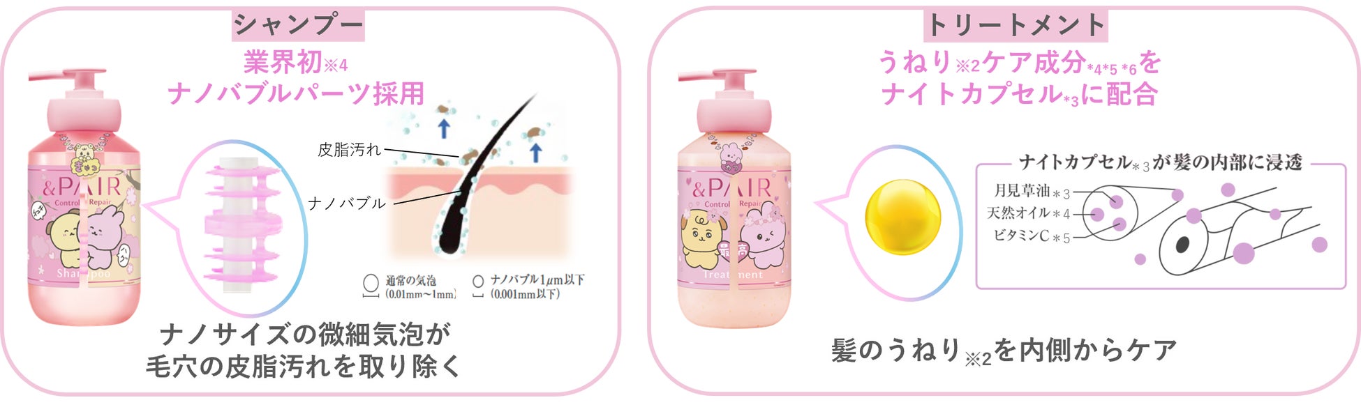 1本で2つの機能を持ち合わせたナノバブルパーツ採用のバブルinシャンプー、ナイトカプセル*3配合のヘアパック inトリートメントでうねり※2やダメージを同時にケアします。
