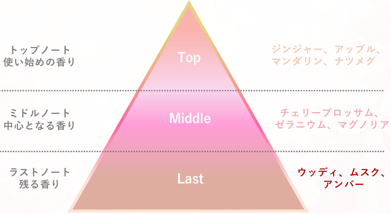今年のアンドハニーサクラシリーズは、シリーズ内初の香調を採用いたしました。どこか落ち着くような「ヒノキ」の香りを感じつつ、春の訪れをイメージした「サクラ」の香りです。「学業や仕事で疲れた身体を癒しながら、リラックスして1日を迎えて欲しい」そんな想いを込めた香りになっています。
