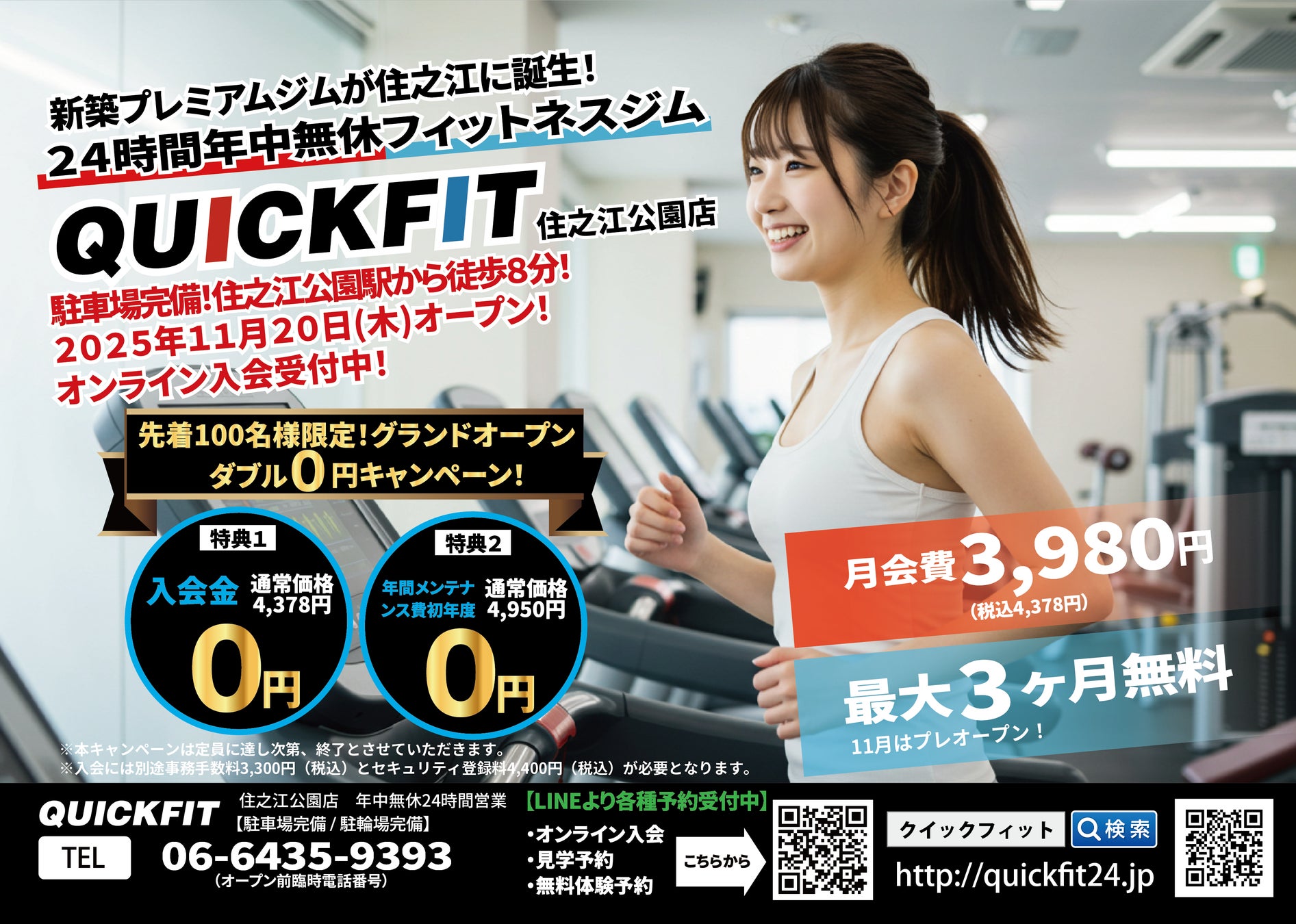 2025年11月20日(木)、株式会社QUICKFIT(本社:大阪市羽曳野市)は、24時間営業フィットネスジム「QUICKFIT住之江公園店」を大阪市住之江区に新規オープンいたします。