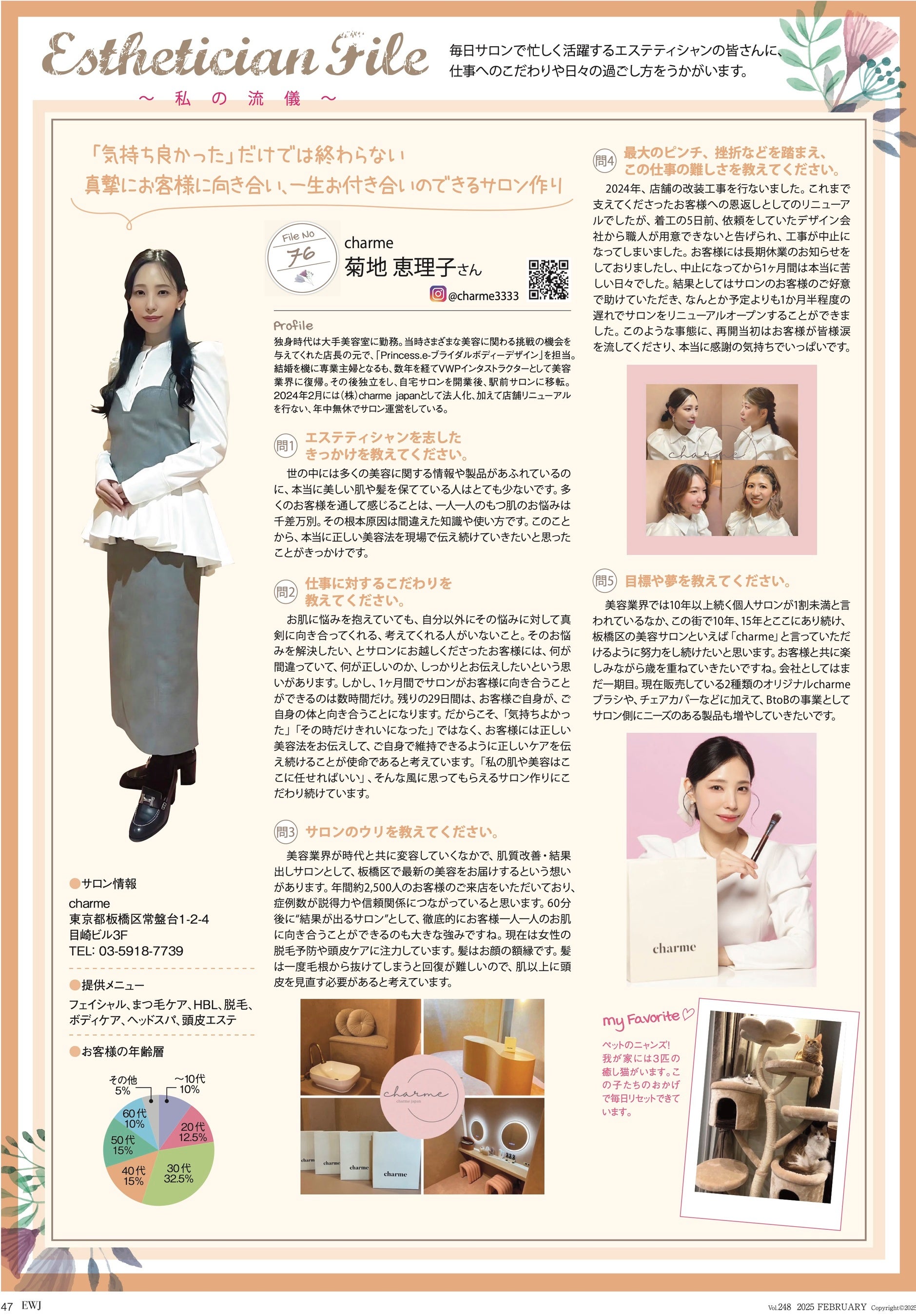2025年2月号では好評連載のEsthetician File File#76にオーナー・菊地恵理子の特集が掲載。