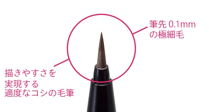 筆先は、0.1mmの極細筆の繊細な毛先と適度なコシでラインの描きやすさにこだわった設計に。目の際のラインも簡単に美しく描くことができます。