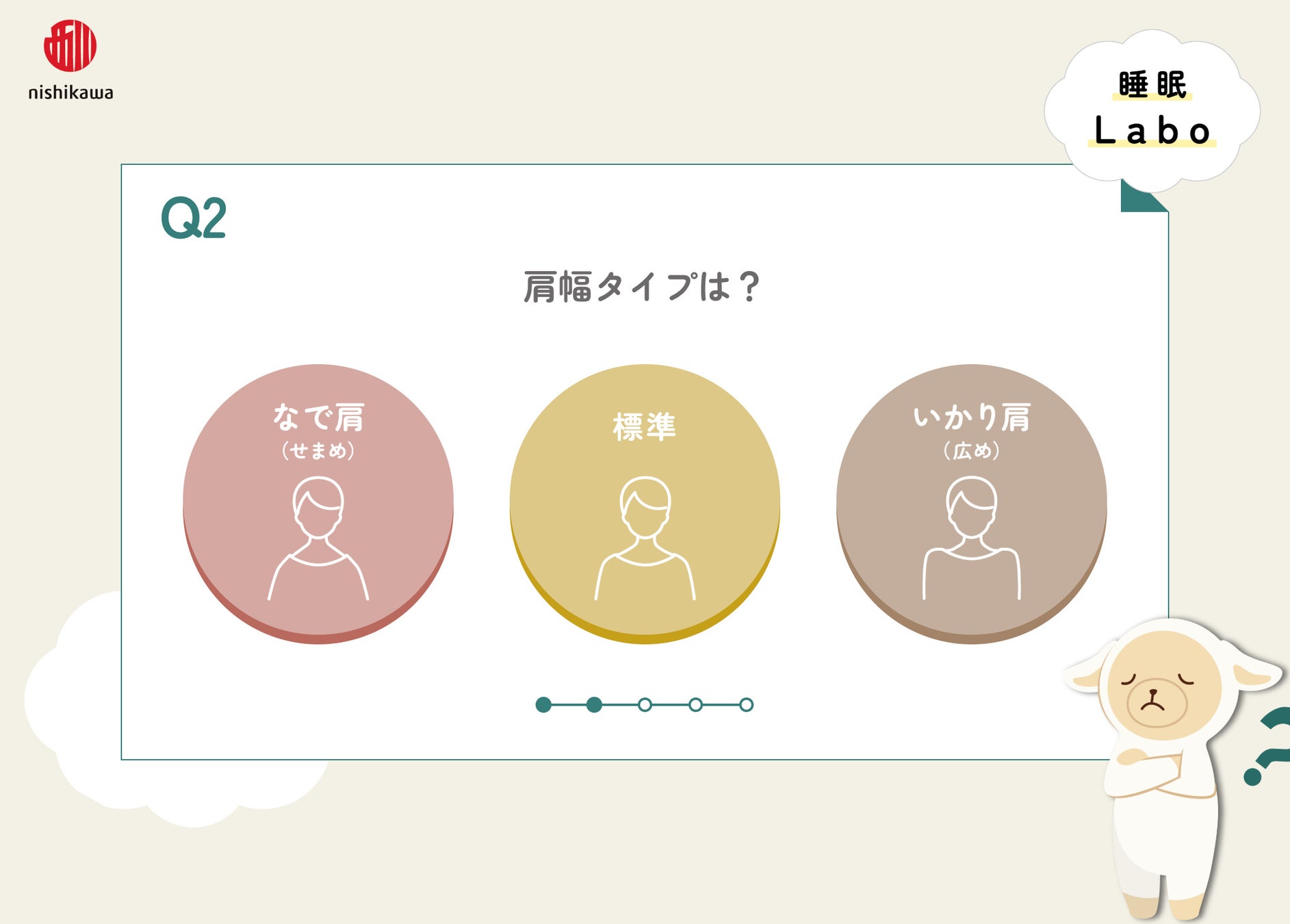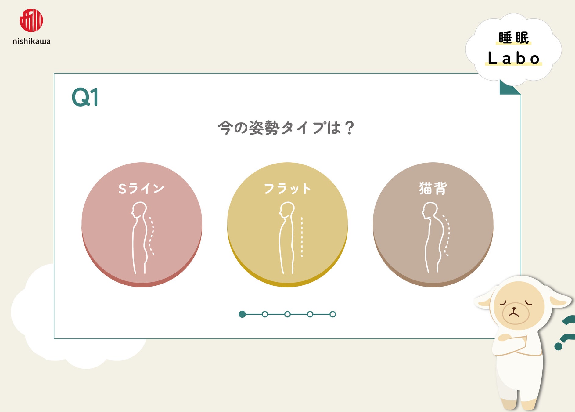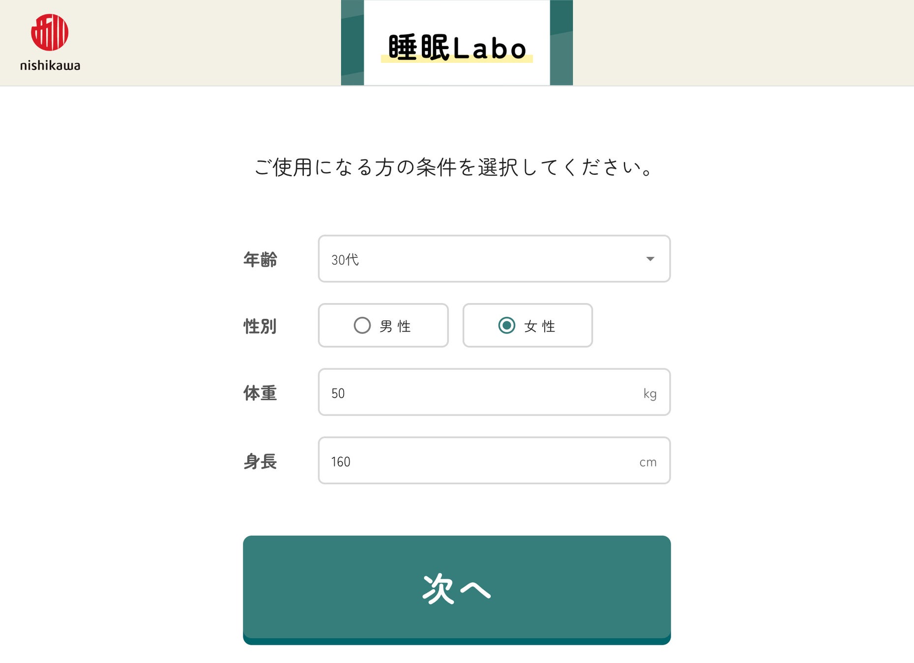 nishikawaでは、人それぞれ異なる体型・環境・睡眠のお悩みなどに対応する様々な商品を展開しています。一方、豊富な商品バリエーションの中で、「どんな寝具が自分に合うのかわからない」と寝具選びに迷うお客様も多くいらっしゃいます。そこで、nishikawaの研究機関「日本睡眠科学研究所」の睡眠の知見や長年培った寝具開発のデータを基に、BMI・姿勢・好みからお客様一人ひとりに合った商品を導き出す「睡眠Labo」を開発しました。
