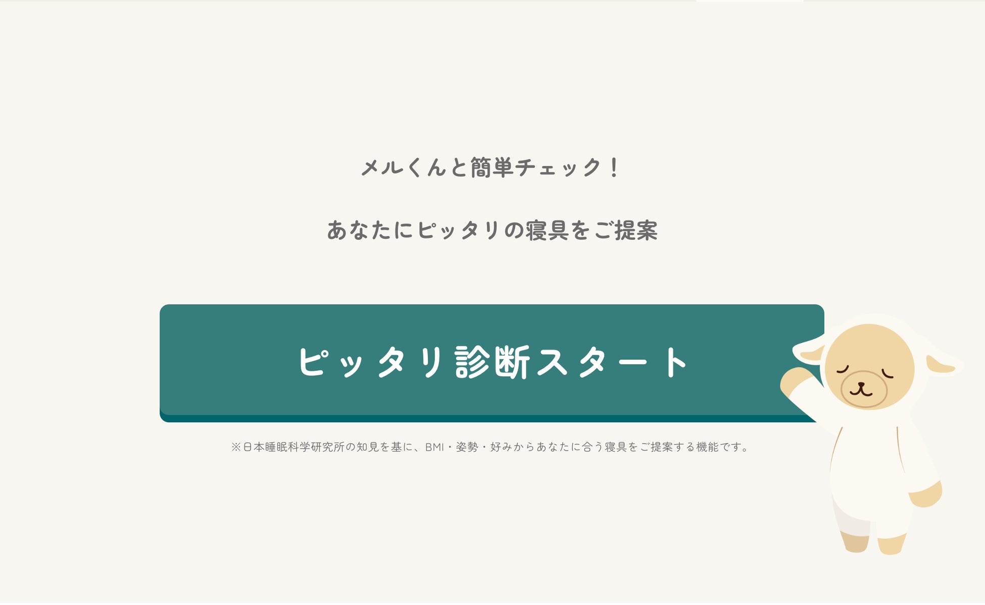 「睡眠Labo」は、nishikawaのオリジナルキャラクター「ひつじのメルくん」※がガイドとなり、6つの質問にお答えいただくだけの簡単な診断です(所要時間60秒程度)。「suyara」「nishikawa睡眠ラボ」「医師がすすめる健康枕」などの#おてごろ西川のまくらとマットレスを対象に、診断結果に合わせておすすめ商品をご提案します。また、睡眠のお悩みに合わせて、nishikawa公式サイトのコラム記事「眠りのレシピ」から解決のヒントなる情報もお届けします。
