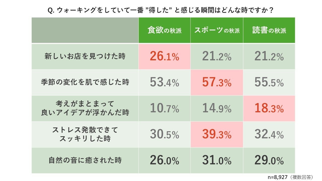 「ウォーキングで一番”得した”と感じる瞬間はどんな時ですか?」という質問では、「食欲の秋派」「スポーツの秋派」「読書の秋派」で回答に選択肢ごとの特徴が現れました。