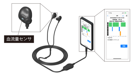 「sNAPout®」は血流量センサを搭載したイヤホンデバイスと、AIを搭載したスマートフォンアプリで構成される仮眠起床システムです。入眠の際は、左右の耳に異なる周波数を流す深睡眠促進音で深い眠りを促します。入眠後は、スマートフォンアプリに内蔵されたAIが血流量データにより高精度かつリアルタイムで睡眠状態を解析。最適なタイミングでアラームを鳴らし仮眠からの起床を誘導します。