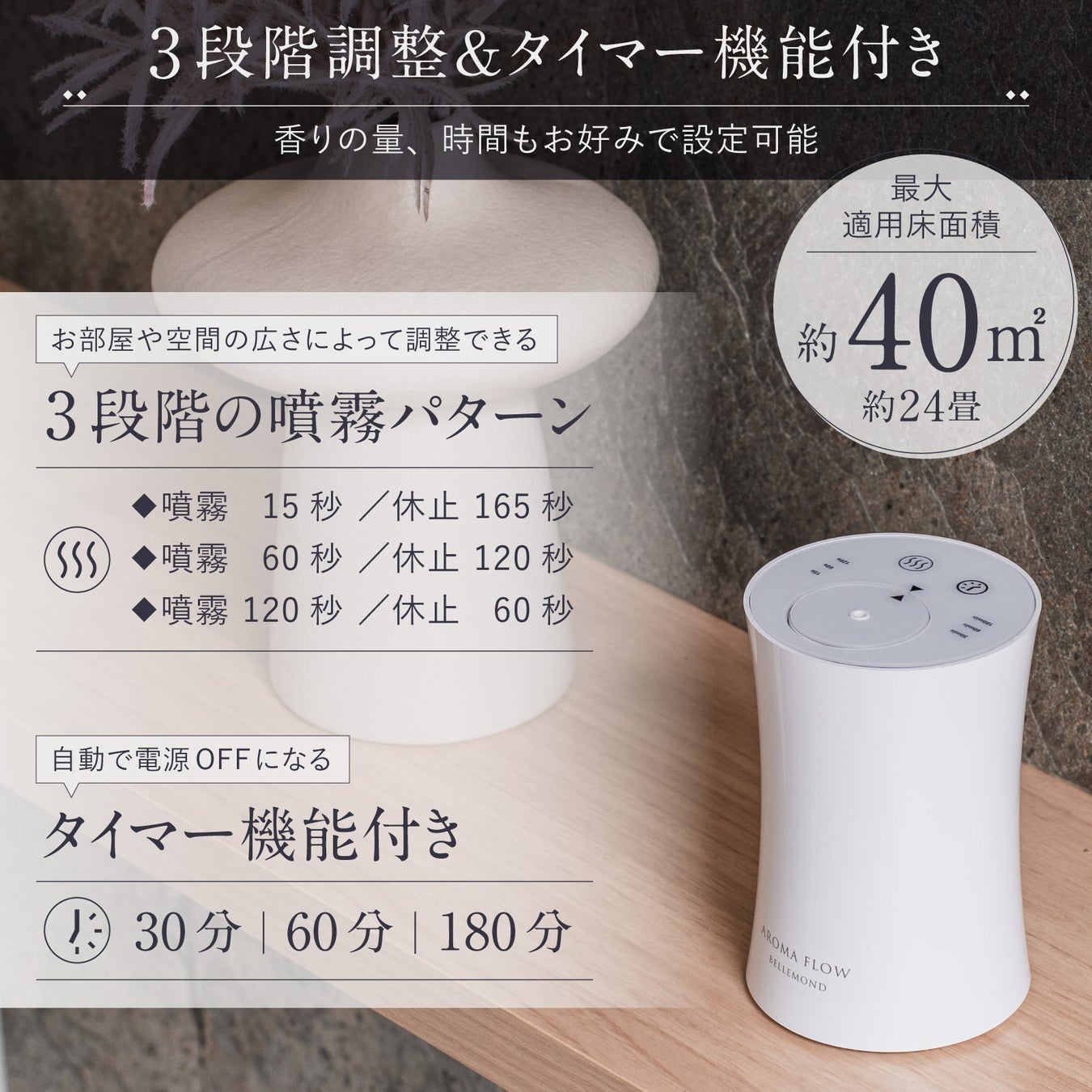 30分、60分、180分のタイマー設定が可能で、香りの調整ができ、就寝時や外出時にも安心して使用できます。