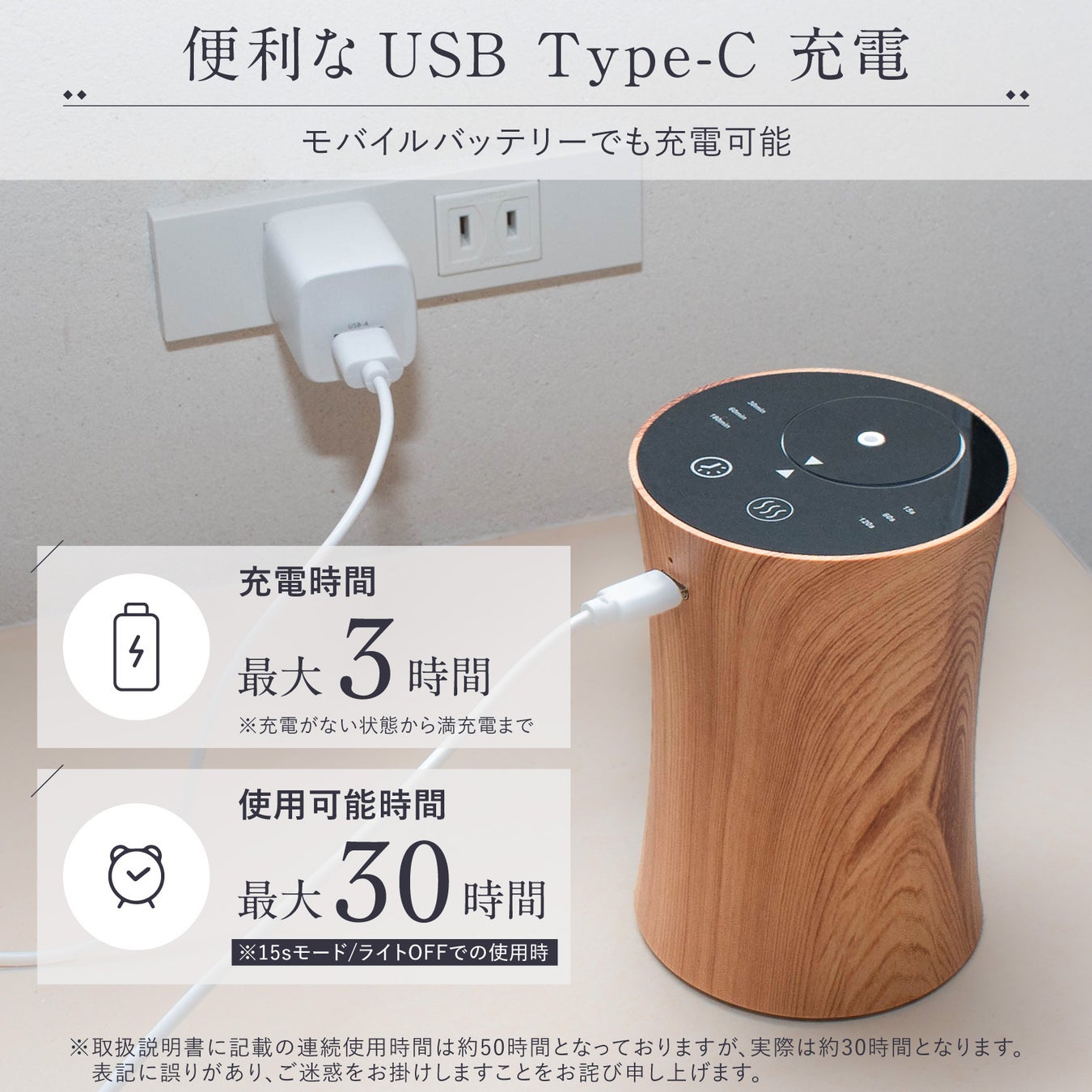 水なしネブライザー式を採用した本製品は、水を使わずエッセンシャルオイルそのものを微細なミストにしてお部屋に拡散。オイル本来の純粋な香りをしっかりと楽しむことができます。USB充電式&コードレス仕様で、最大約30時間の連続使用が可能。