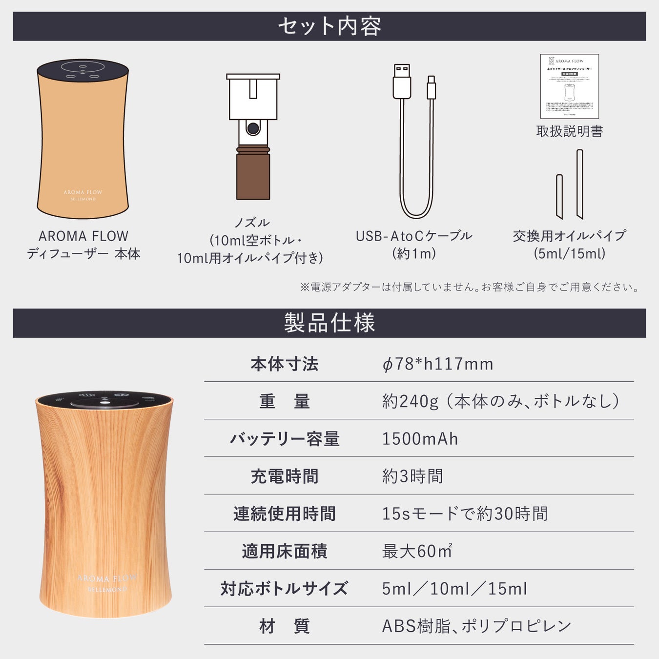 本体には、運転時間を選べるタイマー機能やミスト量の調整機能を搭載。シーンやお部屋の広さに合わせてお好みの香り方にカスタマイズできます。お気に入りのエッセンシャルオイルをセットするだけで、手軽に「香りのある暮らし」を始めていただけます。